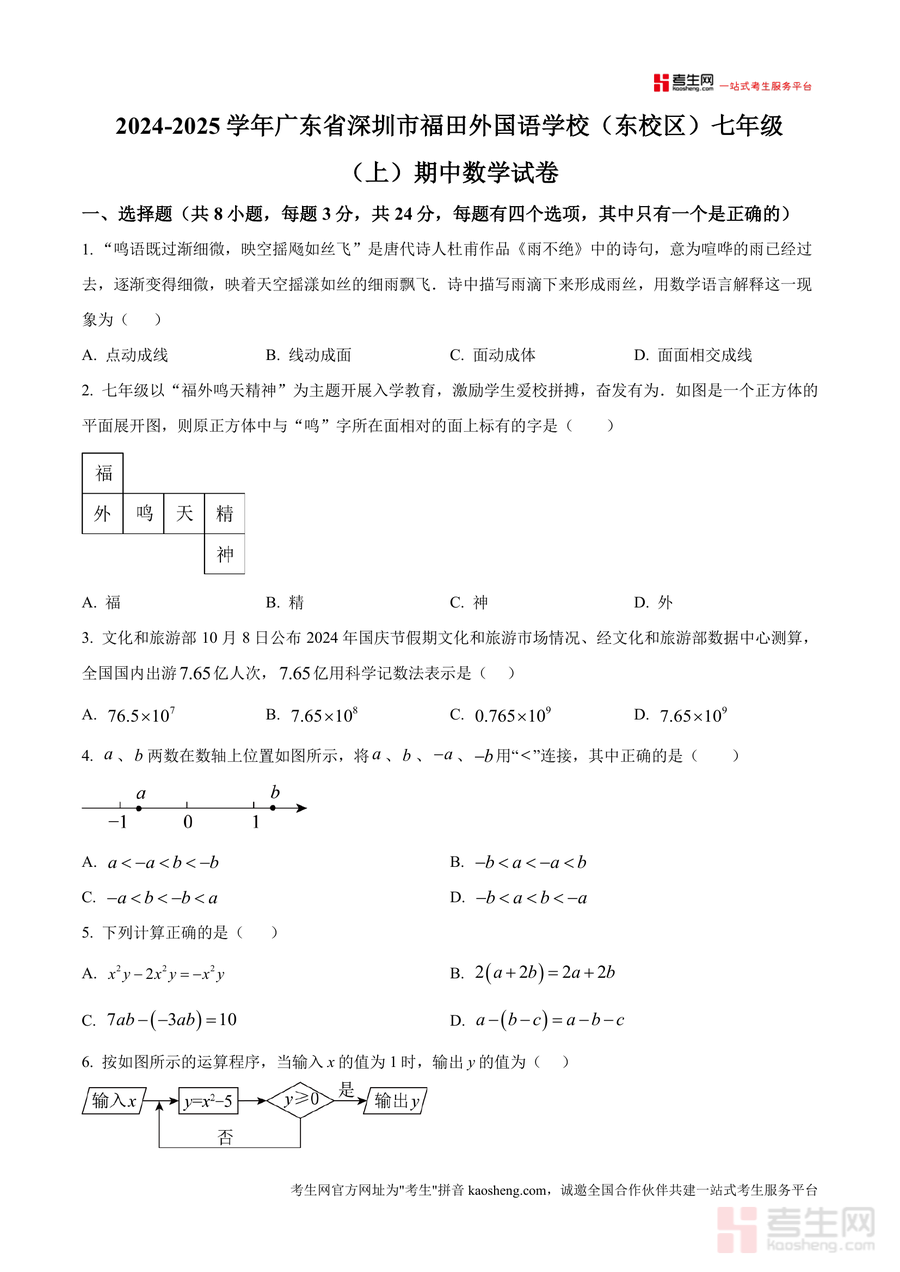 《精品解析:广东省深圳市福田外国语学校(东校区)2024-2025学年七年级上学期期中数学试卷(原卷版).docx》是一份针对七年级上学期数学学习成果检测的标准化试卷资料。该试卷严格遵循人教版七年级数学上册教学大纲,涵盖有理数、整式加减、几何图形初步等核心知识模块,题型包括选择题(8小题)、填空题(5小题)和解答题(7小题),总分值为100分。试卷特色在于将数学知识与实际应用紧密结合,如通过杜甫诗句"鸣语既过渐细微"考查点动成线原理,利用正方体展开图考查空间想象能力,体现了数学学科的实用性与趣味性。
