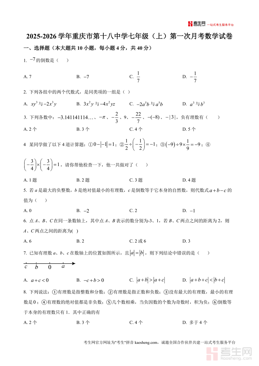 本试卷适用于重庆市及周边地区七年级学生、初中数学教师及关注孩子数学学习进展的家长群体。作为重庆十八中首次月考真题原卷,其内容具有不可替代性,是学生备考过程中获取名校命题思路与题型趋势的重要途径。长期使用此类优质真题资源,不仅能巩固基础知识与解题技巧,还能培养良好应试习惯,为期中期末考试乃至中考数学能力提升奠定系统基础。