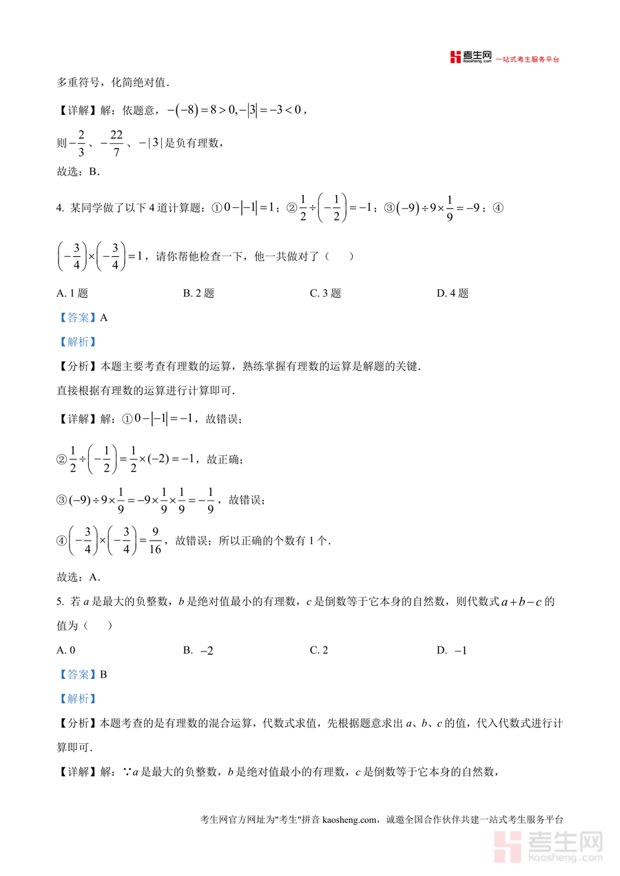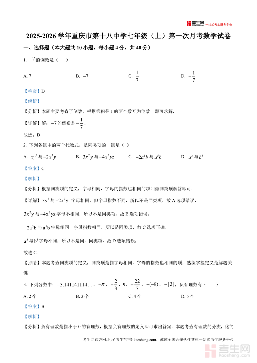 该资料核心用途为辅助七年级学生进行月考备考与知识巩固。适用场景包括课堂复习后的自我检测、考前针对性训练及错题复盘环节;用户价值在于帮助学生精准识别知识薄弱点——如对有理数分类、代数式求值等模块掌握不足处,并通过标准化解题流程提升应试能力。其备考优势突出:依托重庆十八中真实月考命题风格贴合本地教学进度;解析内容注重基础夯实与方法迁移,让学生短时间内高效掌握核心考点解法。