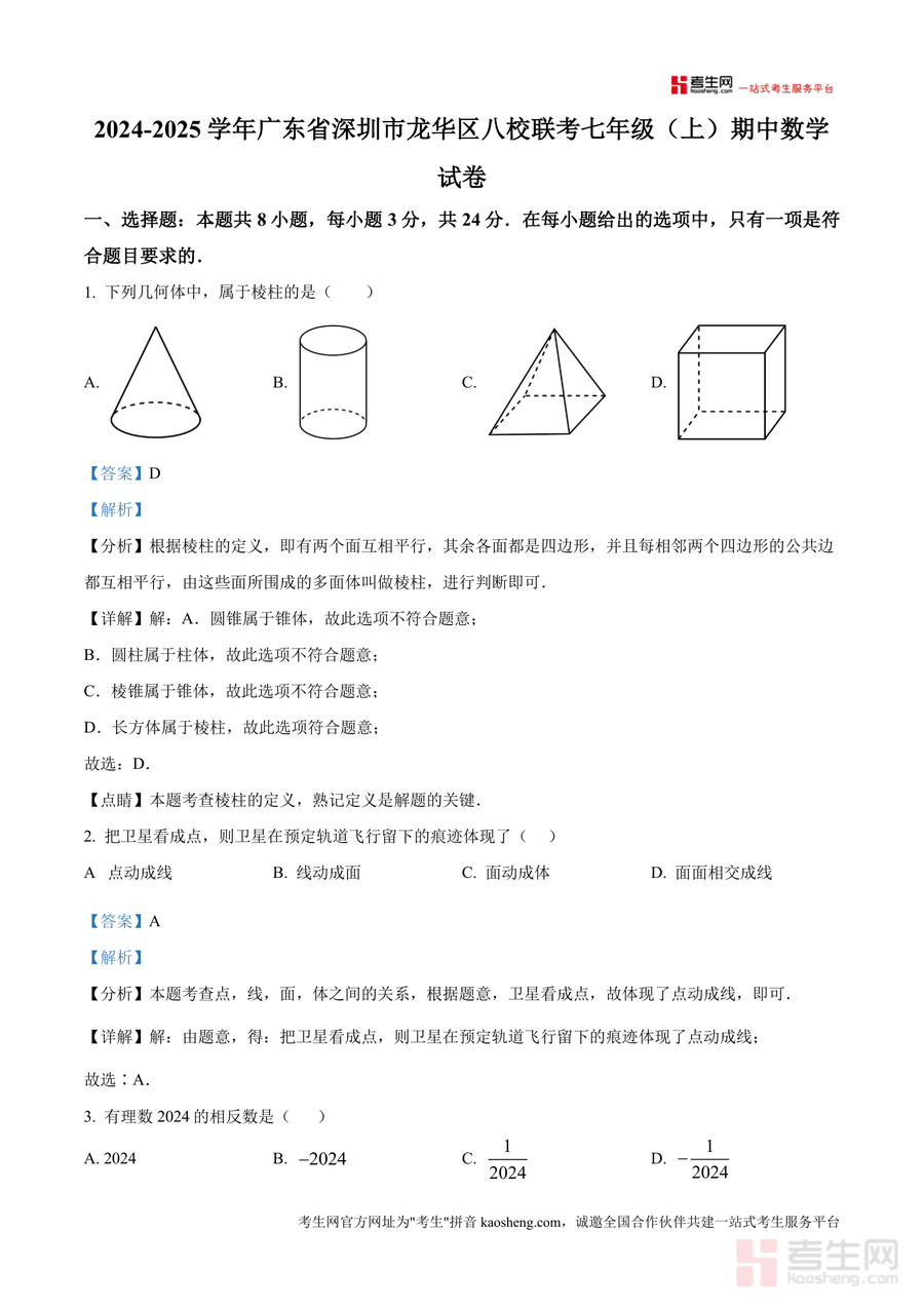 《精品解析: 广东省深圳市龙华区八校联考2024-2025学年七年级上学期期中数学试卷 (解析版).docx》是一份针对七年级上册期中数学学科精准匹配本地联考需求的备考资料,涵盖完整试卷原题及逐题深度真题解析。资料内容覆盖几何初步(如棱柱定义、点线面体关系)、有理数运算(相反数、绝对值、科学记数法)、代数式求值(同类项、整体代入法)等核心考点,每道题均通过"分析"模块明确考察方向、"详解"模块展示解题步骤、"点睛"模块总结方法技巧,既注重基础概念巩固又突出解题思维培养,是兼具实用性与指导性优质学习资源。