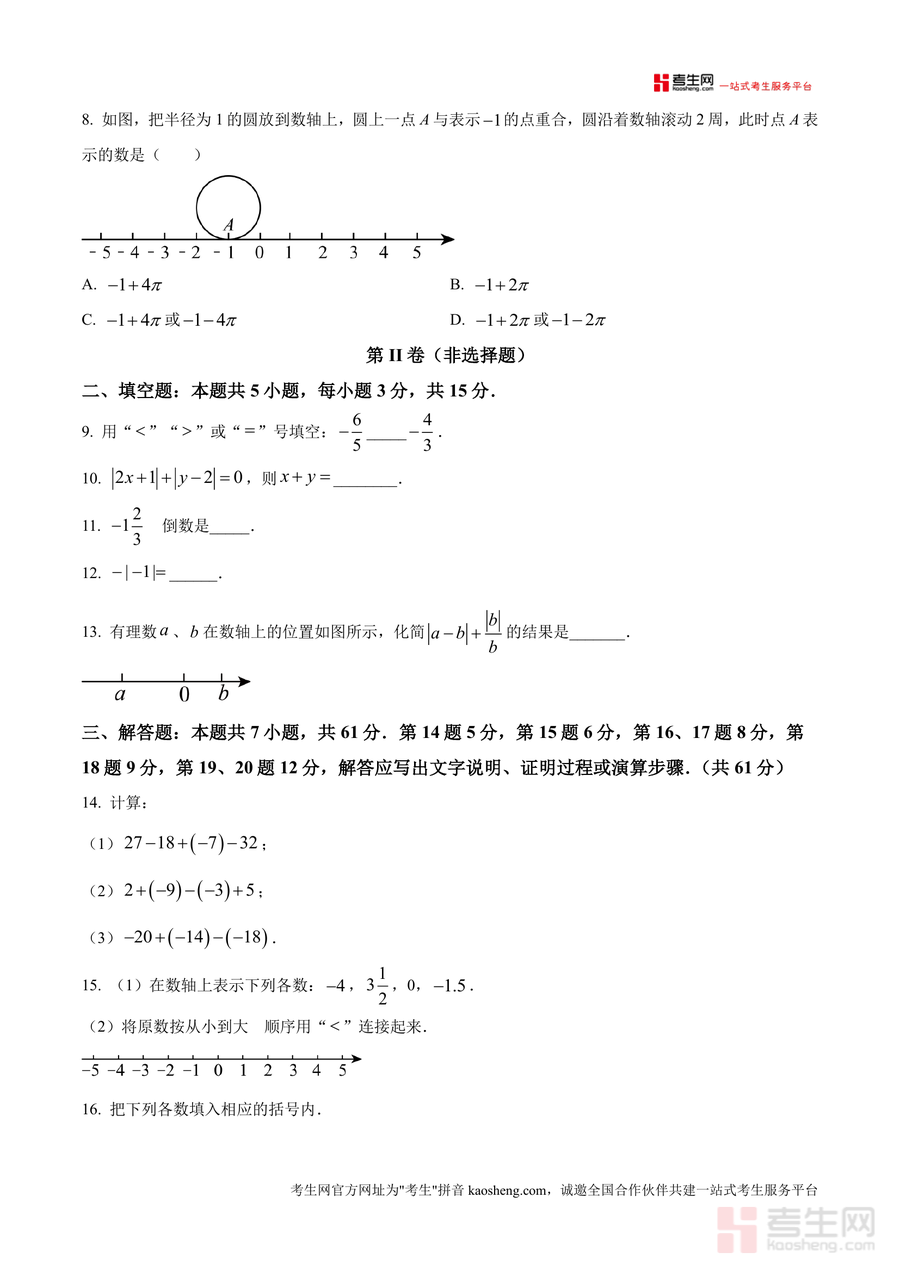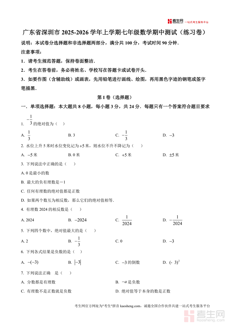 《精品解析:广东省深圳市2025-2026学年上学期七年级数学期中测试(练习卷)-基础卷(原卷版)》是一份针对广东省深圳市七年级学生设计的期中数学备考资料。该资料严格遵循深圳本地七年级数学教学大纲要求,涵盖绝对值、相反数、有理数运算等核心知识点;试卷结构分为选择题(8小题共24分)、填空题(5小题共15分)及解答题(7小题共61分),题型设置贴合期中测试实际,题目难度梯度合理,能有效覆盖基础知识点的考查维度。其特色亮点在于原卷版呈现形式完整还原考试卷面布局与答题规范要求,帮助使用者提前熟悉考试场景与答题流程。