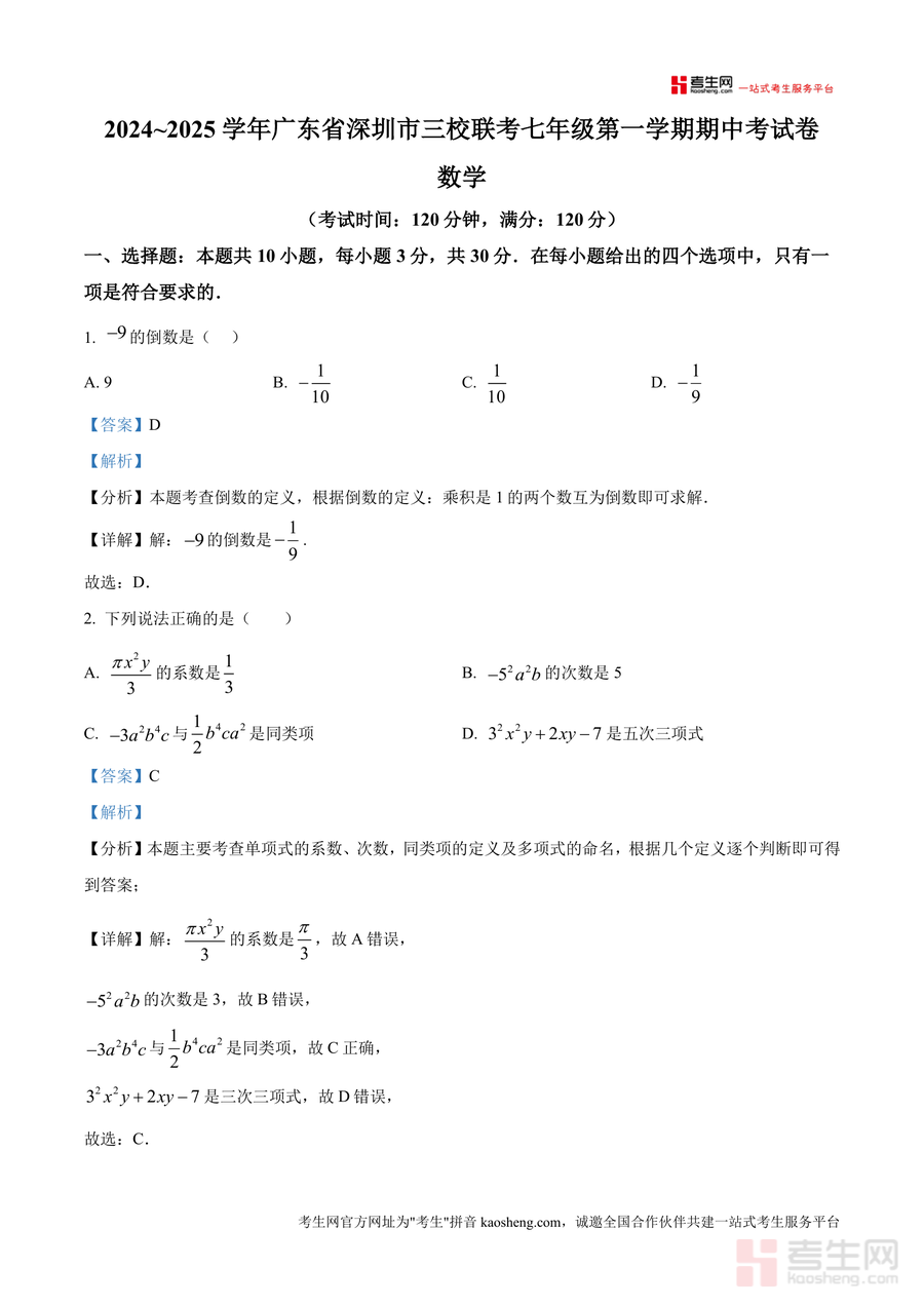 《精品解析:广东省深圳市三校联考2024~2025学年七年级上学期期中考试卷数学(解析版).docx》是一份针对深圳本地七年级数学期中备考需求的专业资料涵盖该次联考全部题型包括10道选择题6道填空题及9道解答题并提供逐题详细解析其特色亮点在于精准定位每道题对应核心考点如倒数定义同类项判断等同时进行解题步骤分层拆解及易错点标注帮助学生深入理解题目本质而非单纯记忆答案