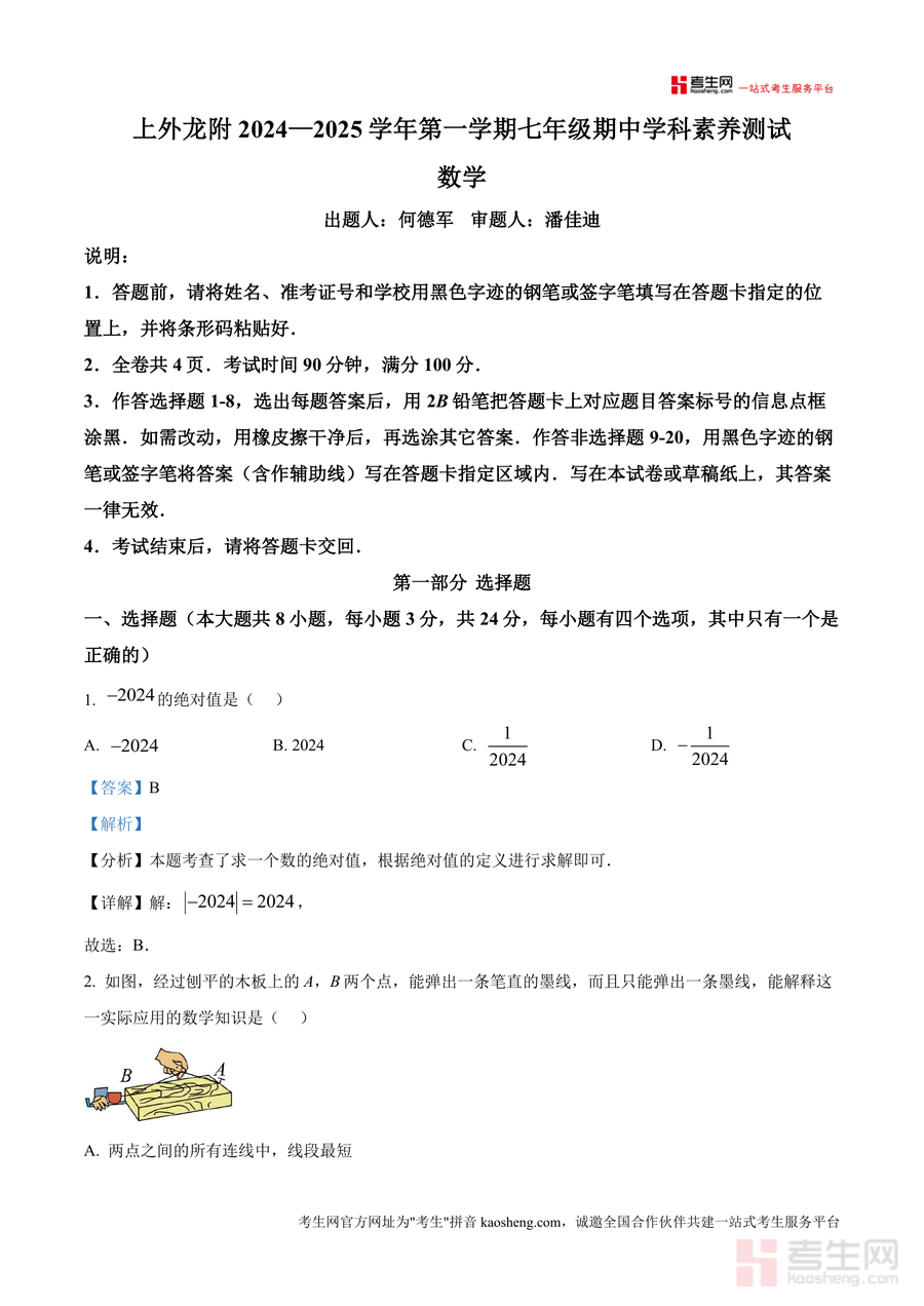 《精品解析:广东省深圳市上海外国语大学附属龙岗学校2024-2025学年上学期七年级期中考试数学试卷(解析版)》是一份针对该校七年级学生期中数学学科素养测试备考设计 的真题解析资料。该资料包含完整试卷原题及对应详细解析,覆盖选择题(8题)、填空题(5题)、解答题(7题)全题型;解析部分针对每道题标注核心考点(如绝对值定义、直线性质、单项式次数等),补充思路分析、易错点提示及解题技巧,帮助学生理解题目本质与命题意图。