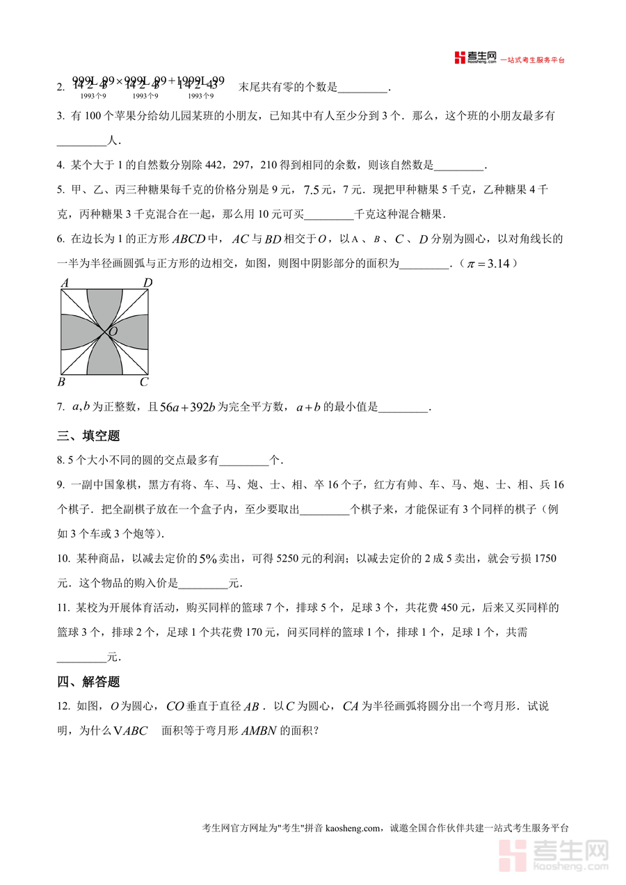 该资料核心用途为帮助学生进行入学前数学知识体系自查与薄弱点强化训练,使用场景包括学生自主备考时模拟测试以熟悉考试节奏、教师用于课堂教学中针对性选题设计、家长辅助孩子进行课后练习提升应试能力;其用户价值在于通过真实题型训练让学生提前适应初中数学从具象到抽象的思维转换,备考优势体现在精准对接本地校考命题方向,有效填补小学与初中数学知识衔接空白,助力学生高效提升应试表现。