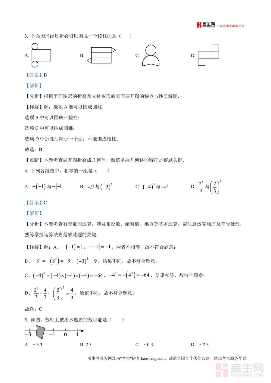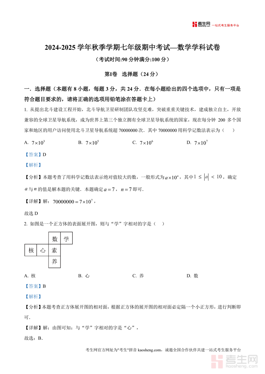 《精品解析:广东省深圳市南山区深圳湾学校2024-2025学年七年级上学期期中考试数学试题(解析版).docx》是一份针对该年级该学期期中考试数学科目的精品备考资料,内容覆盖选择题(如科学记数法表示大数、正方体表面展开图相对面判断等题型)、填空题(含棱柱面数计算、单项式系数与多项式次数求解等考点)、解答题(包括有理数混合运算、数轴表示及几何图形三视图还原等核心模块)。其特色亮点在于每道题均配备详细考点分析、步骤化详解及易错点点睛——如科学记数法题明确a与n值确定规则,正方体展开图题强调相对面“隔一正方形”原则等——助力学生精准把握考点本质与解题逻辑。
