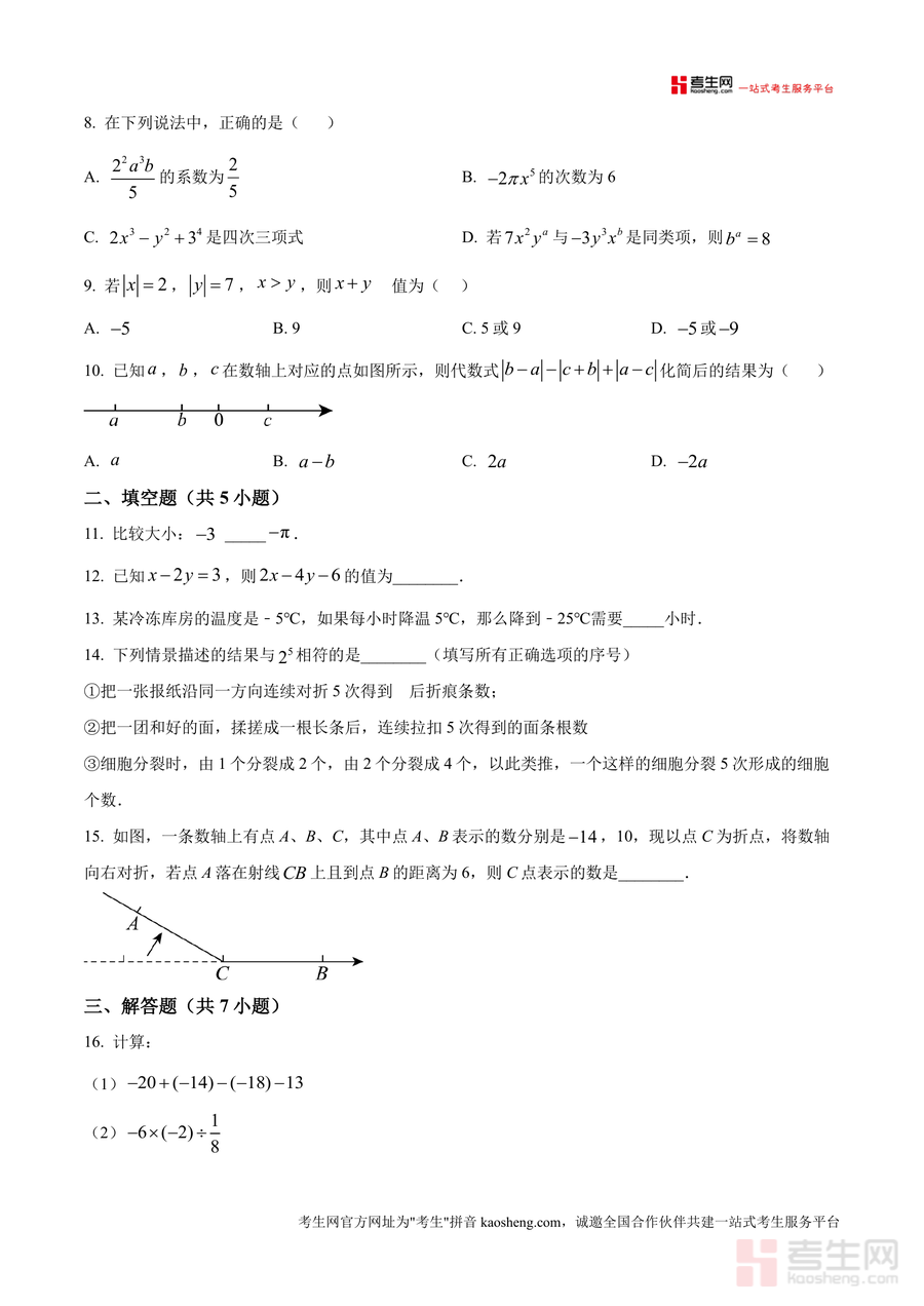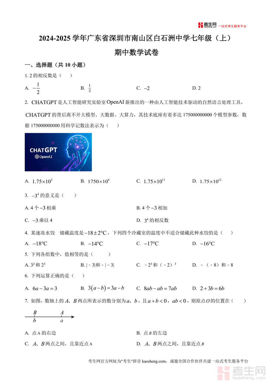 《精品解析:广东省深圳市南山区白石洲中学2024-2025学年上学期七年级期中数学试卷(原卷版).docx》是一份针对广东省深圳市南山区白石洲中学七年级学生设计的期中数学备考核心资料。该试卷聚焦七年级上册数学核心知识模块,包括有理数运算、整式加减、数轴与绝对值应用等内容;题型设置全面覆盖选择题(10小题)、填空题(5小题)及解答题(7小题)三大类,严格贴合深圳南山区初中数学期中命题趋势与白石洲中学的教学实际。其特色在于题目难度梯度合理,既包含相反数判断、科学记数法转换等基础概念题以夯实知识基础,也设置了数轴折叠分析、动点问题求解等综合性试题以培养学生逻辑思维能力。