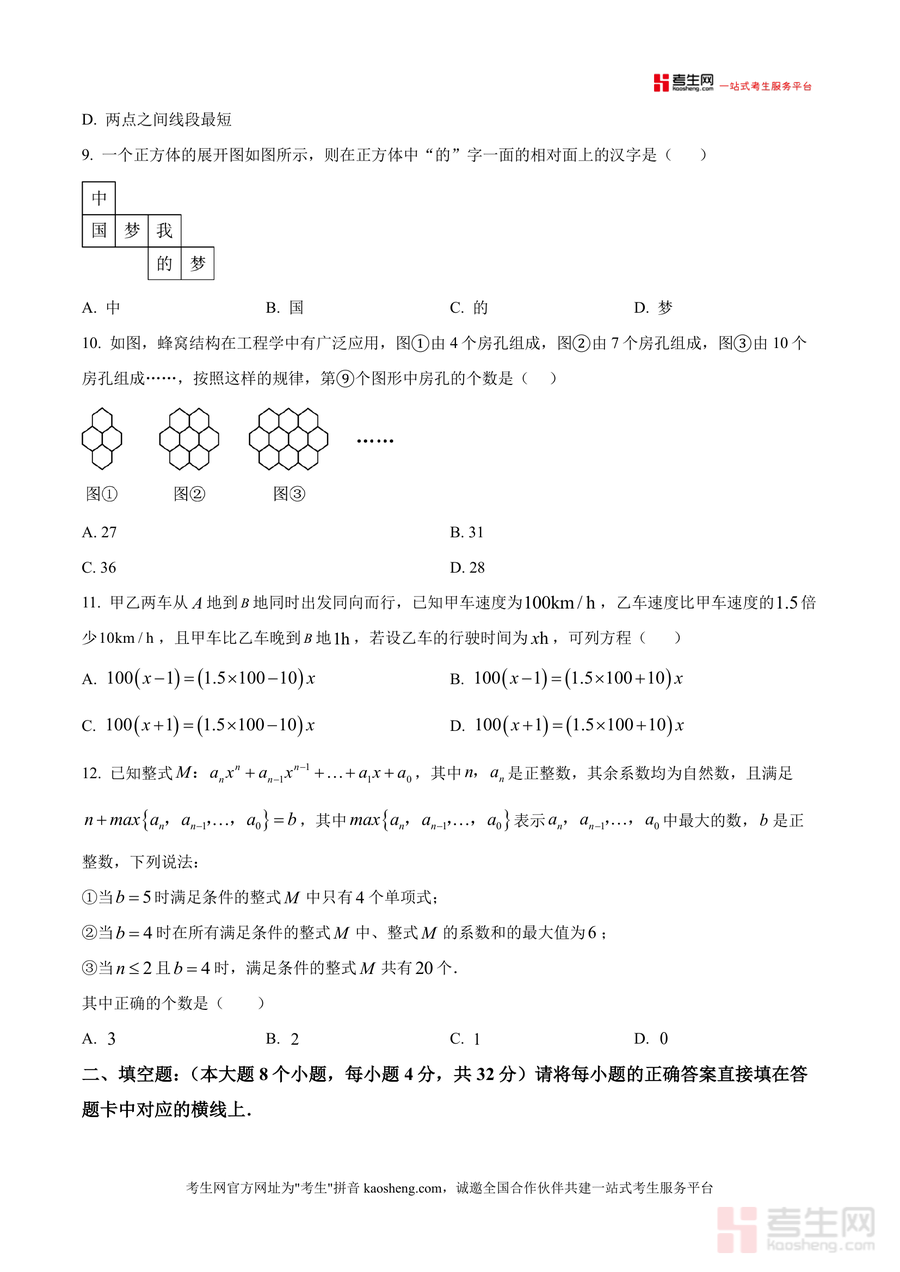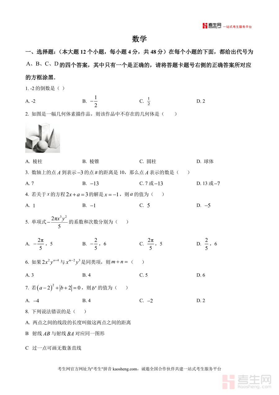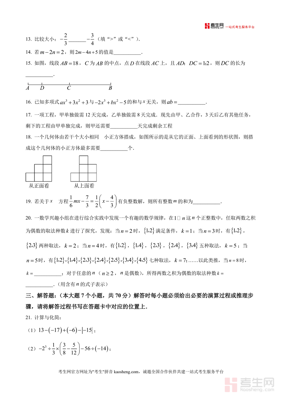 该资料核心用途在于助力七年级学生高效备考月考,同时为数学教师提供教学评估参考与家长辅导依据。使用场景包括学生考前模拟训练以熟悉考试节奏、日常针对薄弱知识点专项练习以巩固基础、考后错题分析以查漏补缺;教师可通过该试卷了解学生阶段性学习情况并调整教学策略;家长则能借助试卷监测孩子学习进度。用户价值体现在帮助学生精准把握月考考点方向,提升应试能力——如通过练习真题掌握常见题型解题方法与技巧,减少考试失误率;备考优势在于其作为名校真题具有高度参考性,让学生提前适应名校考试难度与命题风格,避免盲目复习。