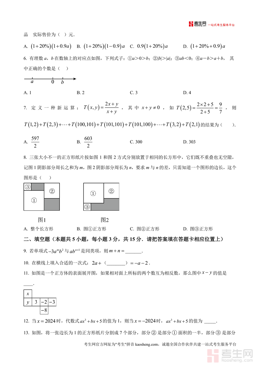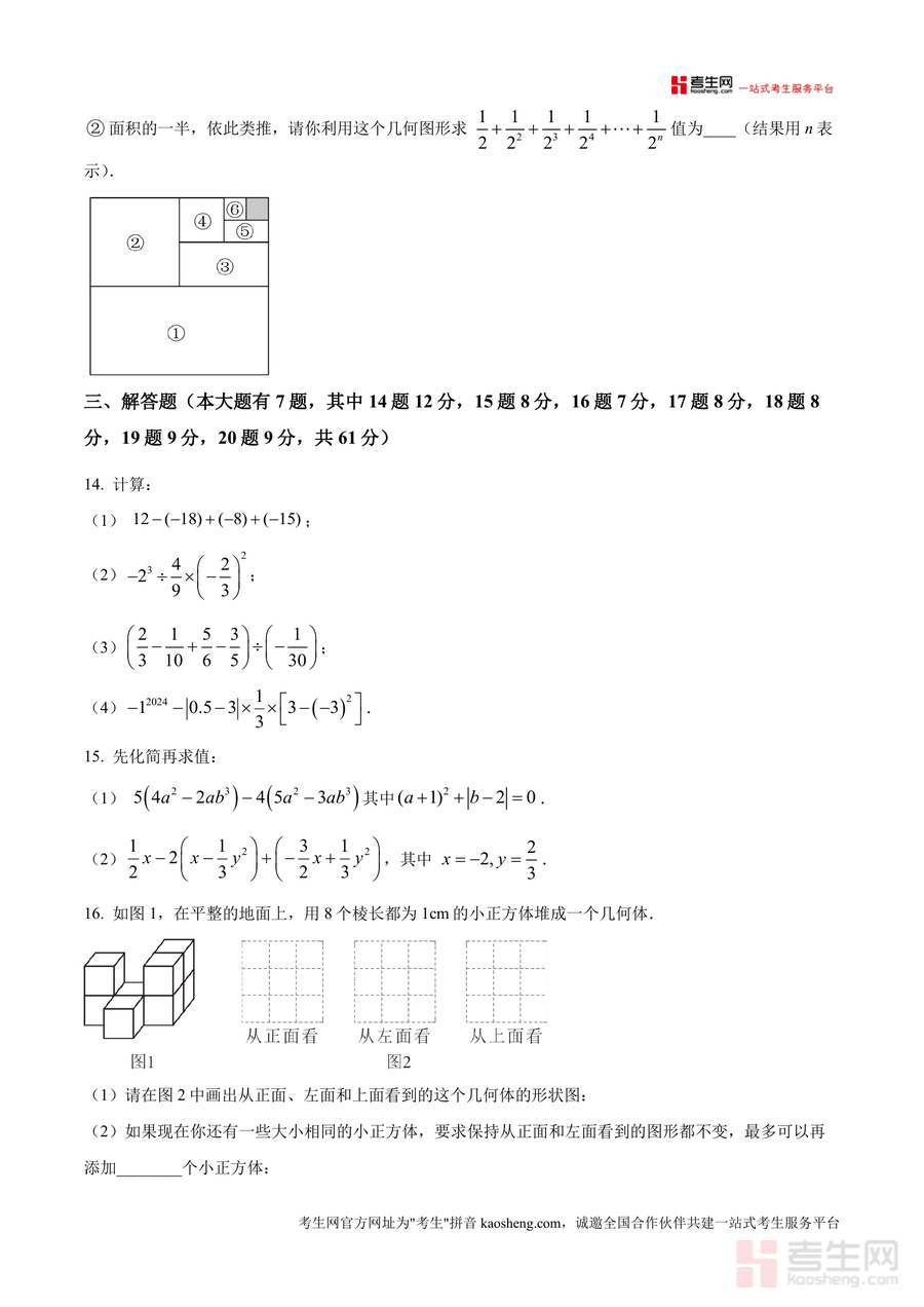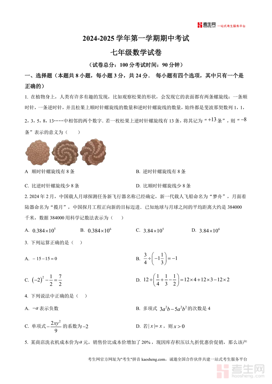 《精品解析:广东省深圳市南山外国语学校(集团)2024-2025学年七年级上学期期中考试数学试卷(原卷版)》是一份针对南外七年级上册期中数学考试的权威备考资料。该试卷包含8道选择题、5道填空题及7道解答题,覆盖有理数运算、代数式化简求值、几何图形展开与表面积计算、新定义除方运算等核心知识点;题目设计结合斐波那契数列的松果螺旋线、探月工程距离的科学记数法等实际情境,既贴合教材内容又注重应用能力考查。作为原卷版资料,其特色在于完整呈现考试原题结构与分值分布,保留命题细节,为学生提供真实准确的考试参考依据。