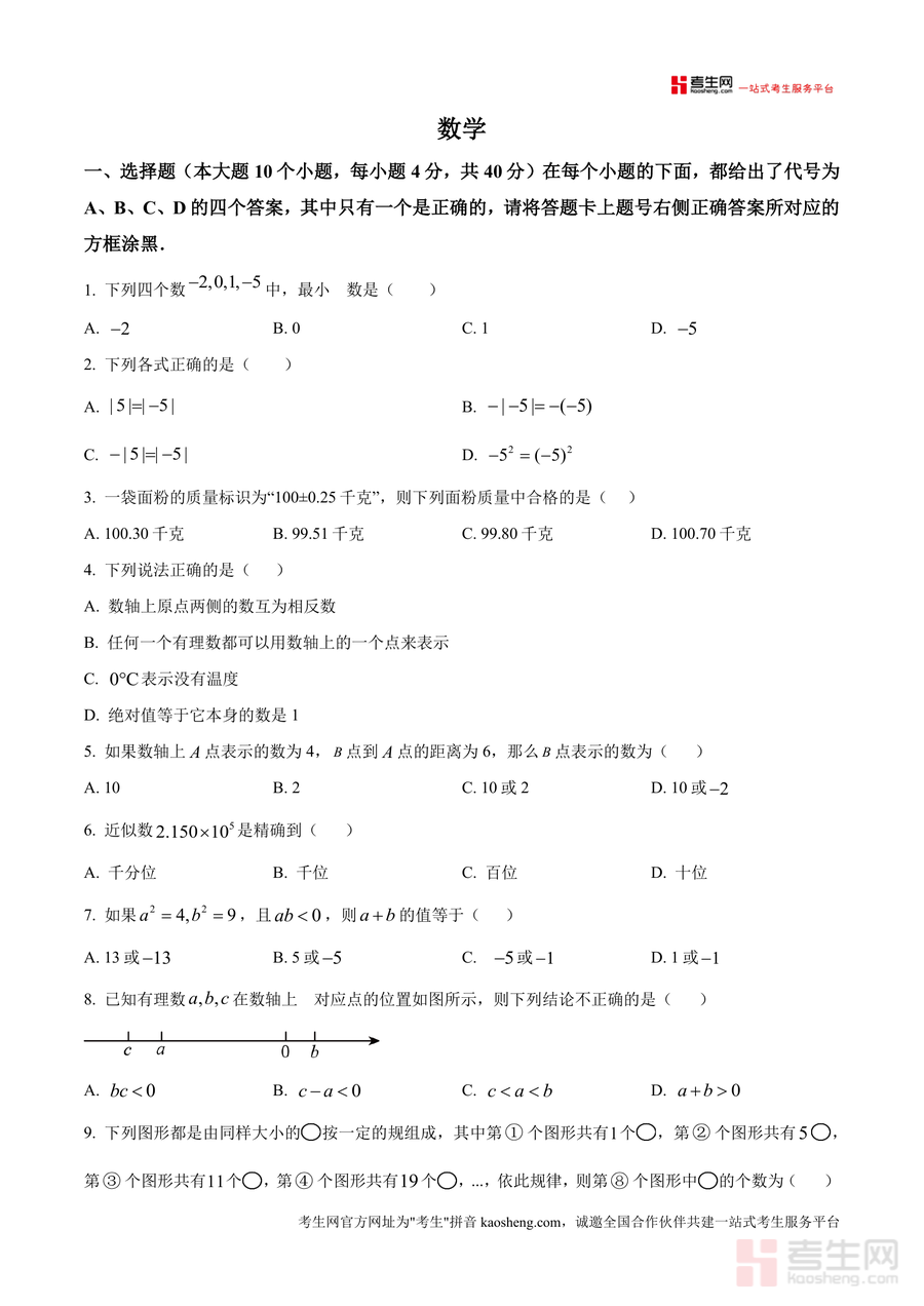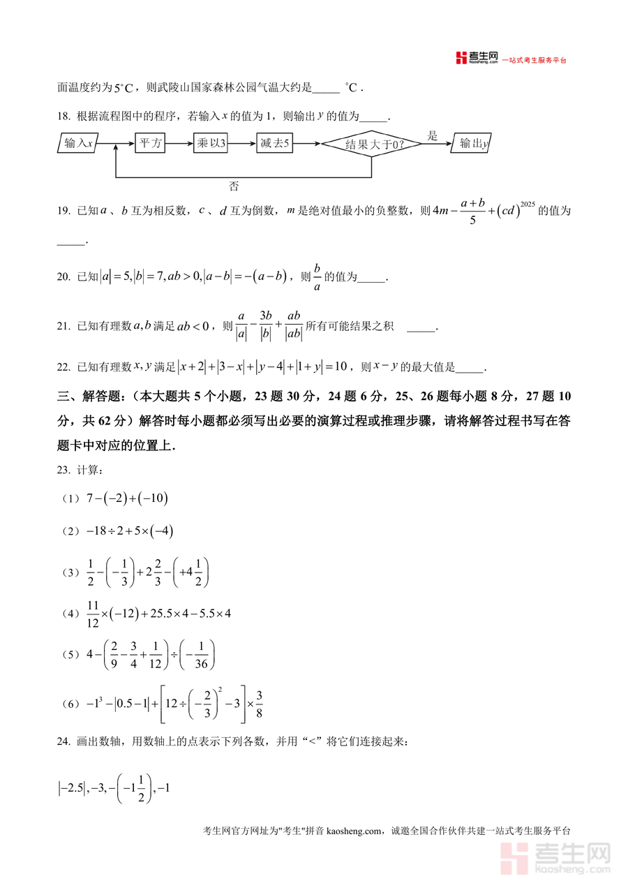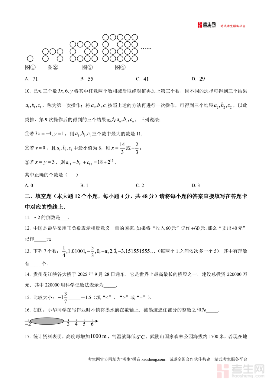 《精品解析:重庆市鲁能巴蜀中学校2025-2026学年上学期10月月考七年级数学试题(原卷版)》是一份针对七年级数学阶段性学习的高质量备考资料。该资料包含选择题(10道)、填空题(12道)及解答题(5道)三大题型共27道题目,全面覆盖有理数概念与运算、数轴应用、相反数与倒数、科学记数法、新定义运算等七年级上册核心知识点。其特色亮点在于严格贴合重庆鲁能巴蜀中学教学进度与命题风格,题目设置梯度分明——既有基础巩固型题目(如倒数计算、正负数表示相反意义量),也有中档能力提升题(如数轴折叠问题、规律探究题),更包含压轴思维拓展题(如多次操作后的数值变化分析),能精准反映该校阶段性教学要求与学生能力考查方向。