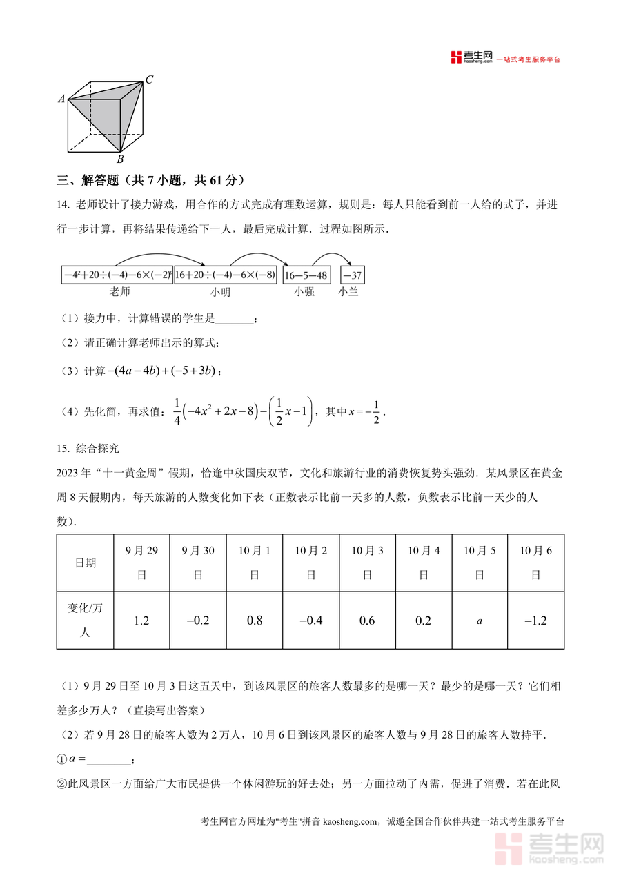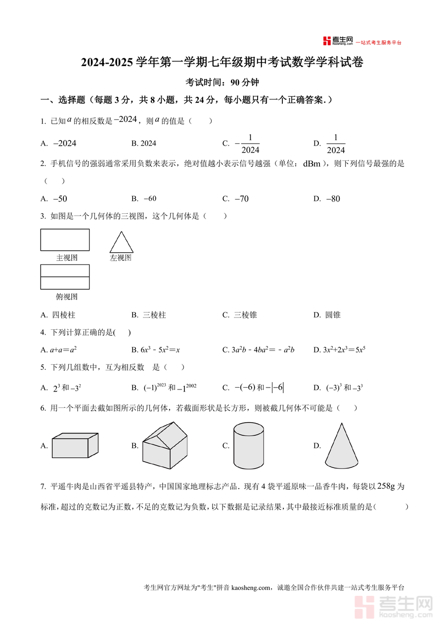 《精品解析:广东省深圳市宝安中学(集团)实验学校2024-2025学年上学期七年级期中考试数学科试卷(原卷版).docx》是一份精准对接深圳本地校考命题趋势、聚焦七年级数学核心知识点的优质备考资料。该资料完整呈现该校期中数学考试原题形式与内容框架,包含90分钟考试时长下三类题型——选择题(8小题共24分)、填空题(5小题共15分)、解答题(7小题共61分);考点覆盖相反数、绝对值、三视图识别、整式运算与化简求值、新定义运算、几何截面分析等七年级上学期重点内容,并融入本地文化元素(如平遥牛肉质量问题)与生活应用场景(如自来水收费、旅游人数统计)等特色设计。