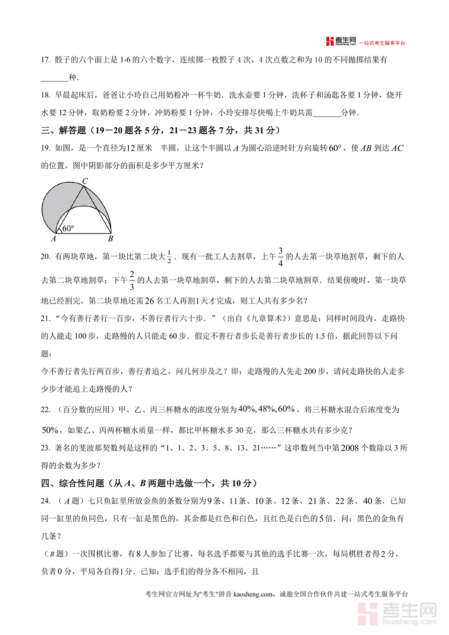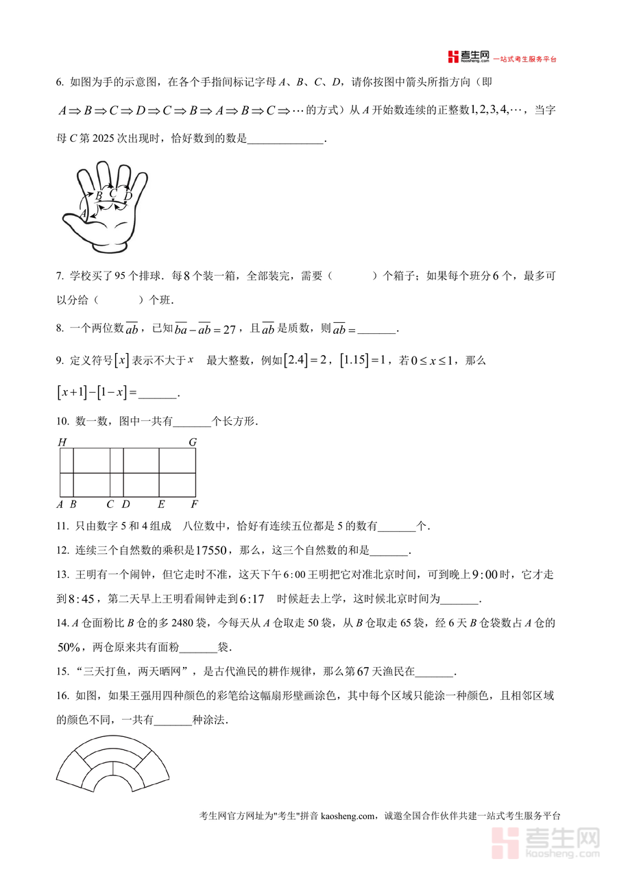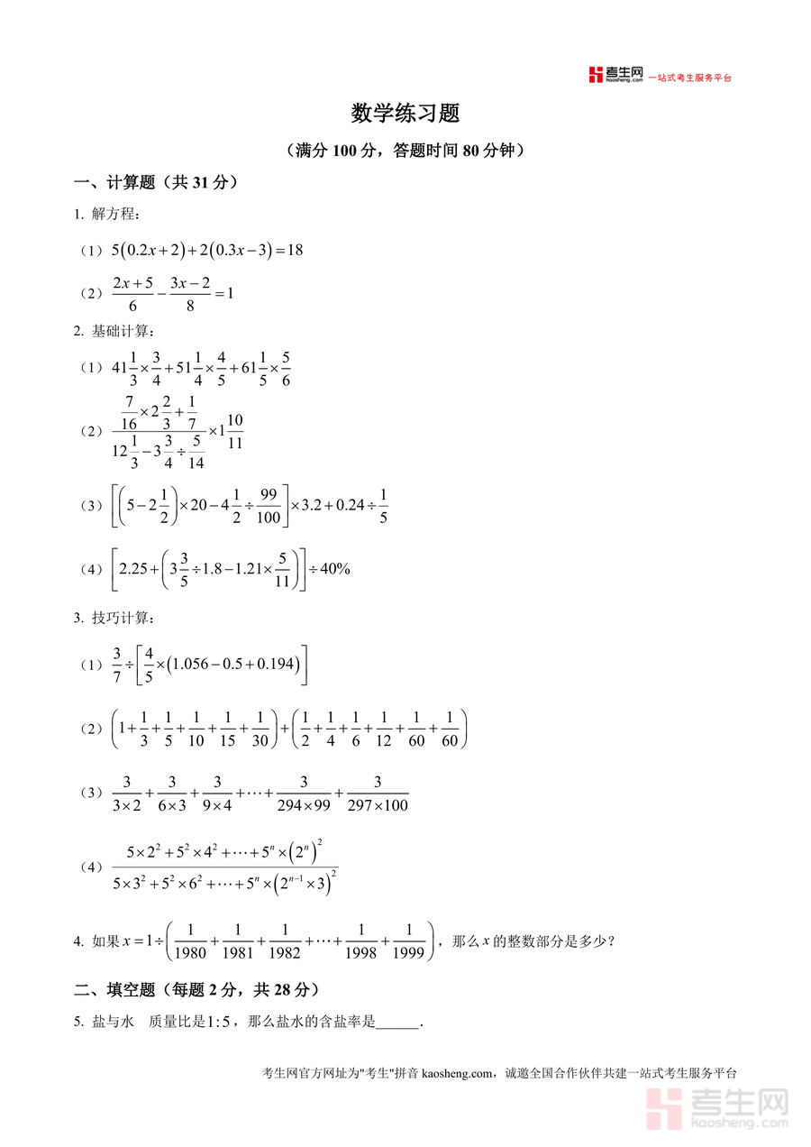 《精品解析:重庆西南大学附属中学校2025-2026学年上学期七年级小升初数学测试(原卷版).docx》是一份针对重庆西南大学附属中学小升初衔接阶段设计的权威数学备考资料。该资料严格遵循西大附中命题风格与难度梯度,包含四大核心模块:计算题(含解方程、基础运算、技巧计算及整数部分分析)、填空题(覆盖含盐率计算、周期规律(如字母C出现次数)、定义新运算、几何计数、实际应用问题等)、解答题(涉及几何面积旋转、工程问题、《九章算术》古代应用题、浓度问题等)及综合性选做题(逻辑推理类如金鱼颜色分配或围棋比赛得分分析)。完整还原真实测试场景(满分100分,答题时间80分钟),其特色在于题型覆盖全面且兼具灵活性,既考查基础运算能力,又注重逻辑思维与综合应用能力提升,能有效帮助学生熟悉目标校考试重点与命题趋势。