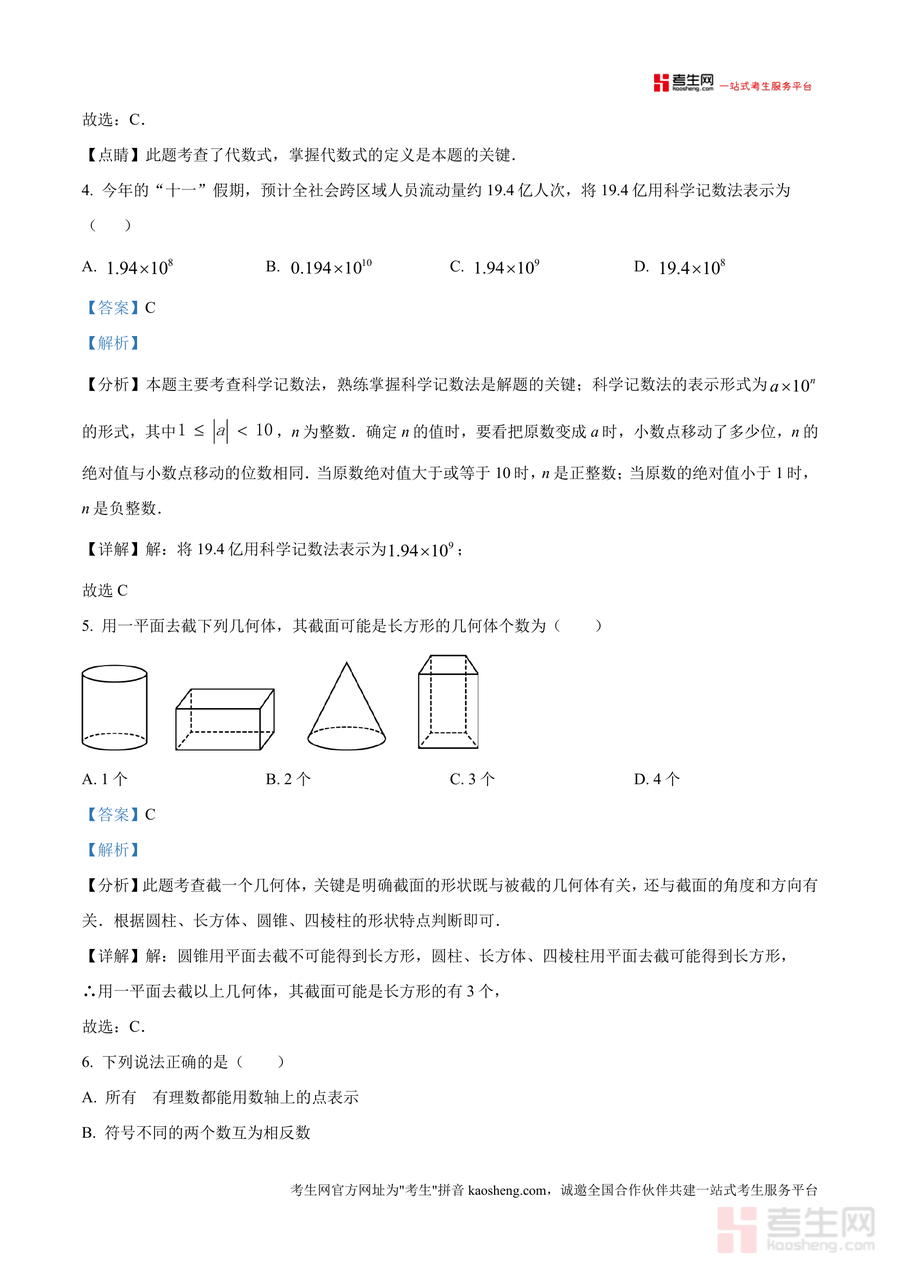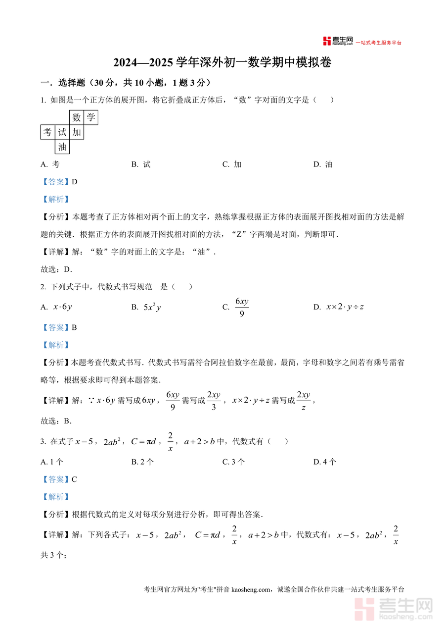 《精品解析:广东省深圳市深圳外国语学院2024-2025学年七年级上学期期中数学试题(解析版).docx》是一份针对深圳外国语学院七年级学生期中数学备考设计专业真题解析资料,涵盖选择题、填空题、解答题全题型内容,特色亮点在于每题配备详细解析,包含考点分析、解题思路及步骤演示,如正方体展开图相对面判断、代数式书写规范等考点深入拆解,科学记数法、截面问题等题型技巧总结,为学生提供全面精准知识参考。