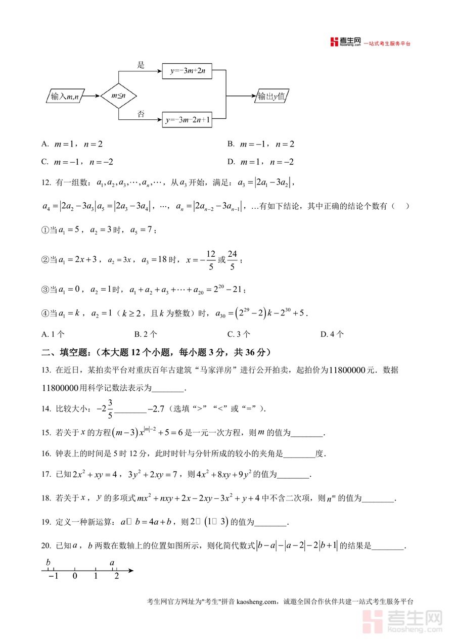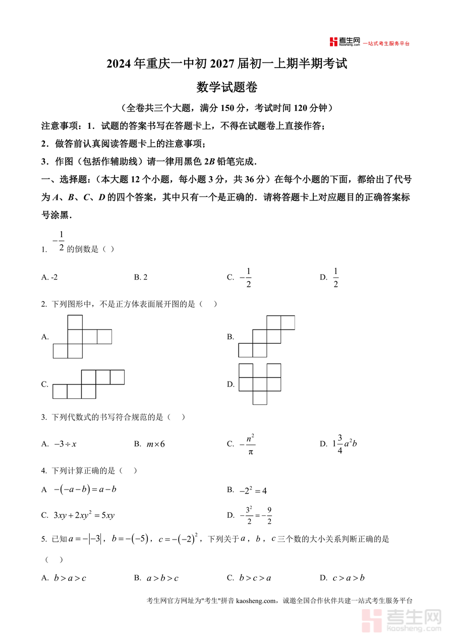 《精品解析:重庆市第一中学校2024-2025学年七年级上学期11月期中数学试题(原卷版).docx》是一份针对七年级学生期中数学备考设计的权威真题资料,核心内容涵盖选择题(12小题共36分)、填空题(12小题共36分)及解答题(8小题共78分)三个大题,完整呈现该校初2027届期中考试原题。其特色亮点在于依托重庆一中作为重点中学的命题权威性,题型覆盖有理数运算、代数式化简、一元一次方程、几何图形初步等七年级上册核心知识点,严格遵循课标要求与该校教学进度,能精准反映期中考查重点与难度梯度,且包含新定义运算、规律探究等创新题型,体现学科素养导向。