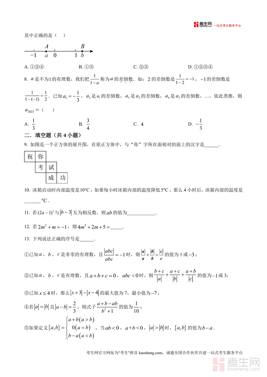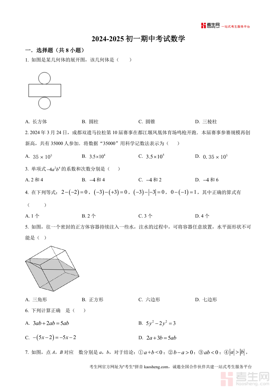 《精品解析:广东省深圳市福田区实验教育集团侨香学校2024-2025学年七年级上学期期中考试数学试卷(原卷版).docx》是一份针对该校七年级上学期期中数学考试设计的标准化原卷资料。文件包含完整题型结构:8道选择题、5道填空题及7道解答题,覆盖几何体展开图判断、科学记数法表示、单项式系数与次数辨析、有理数运算等核心知识点。其特色亮点在于严格贴合深圳福田区侨香学校教学进度与命题风格——如选择题融入本地真实情境(成都双遗马拉松参赛人数统计),解答题包含折线数轴动点问题、抽奖模型探究等校考特色题型,提供贴近真实考试场景的练习载体。