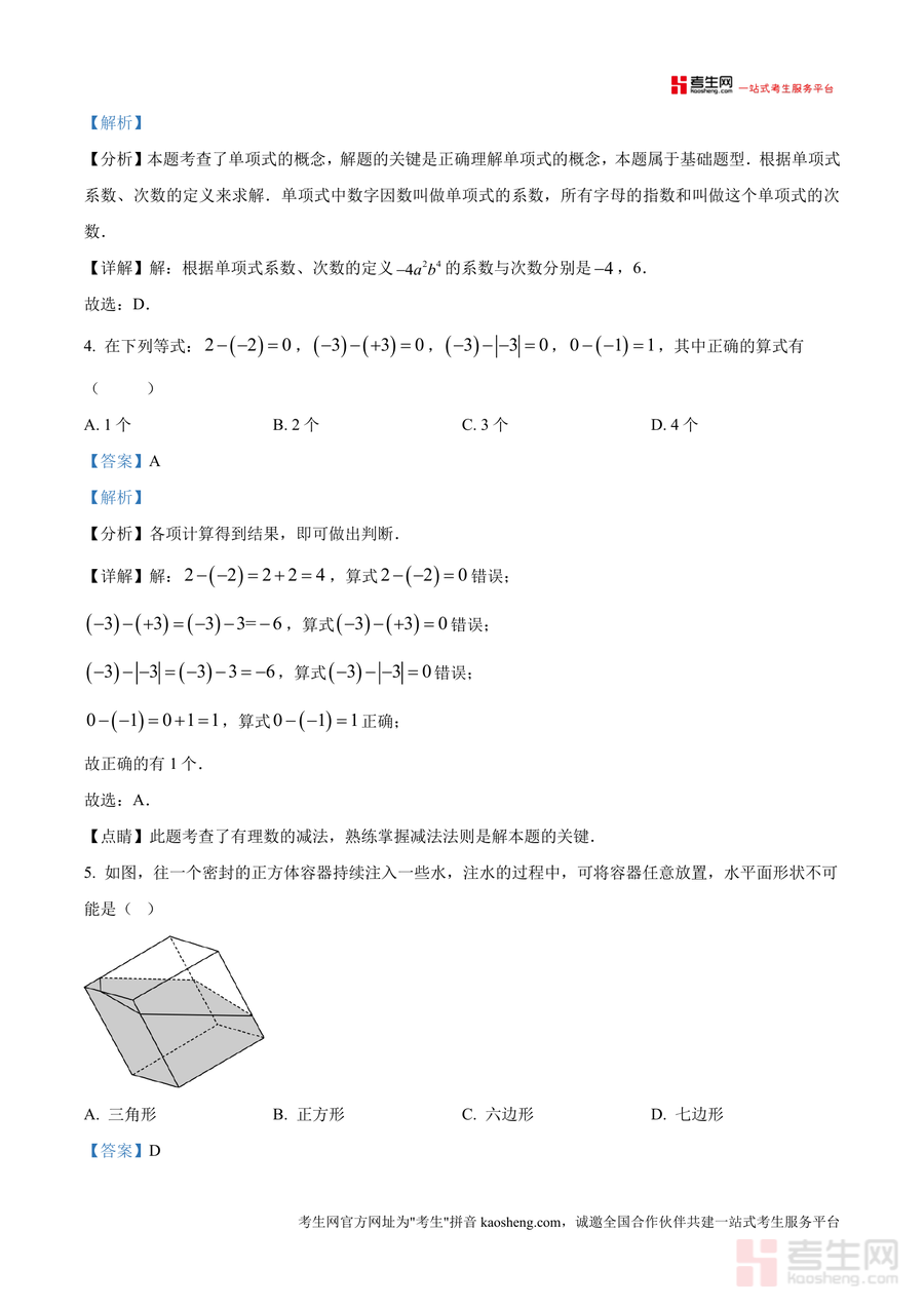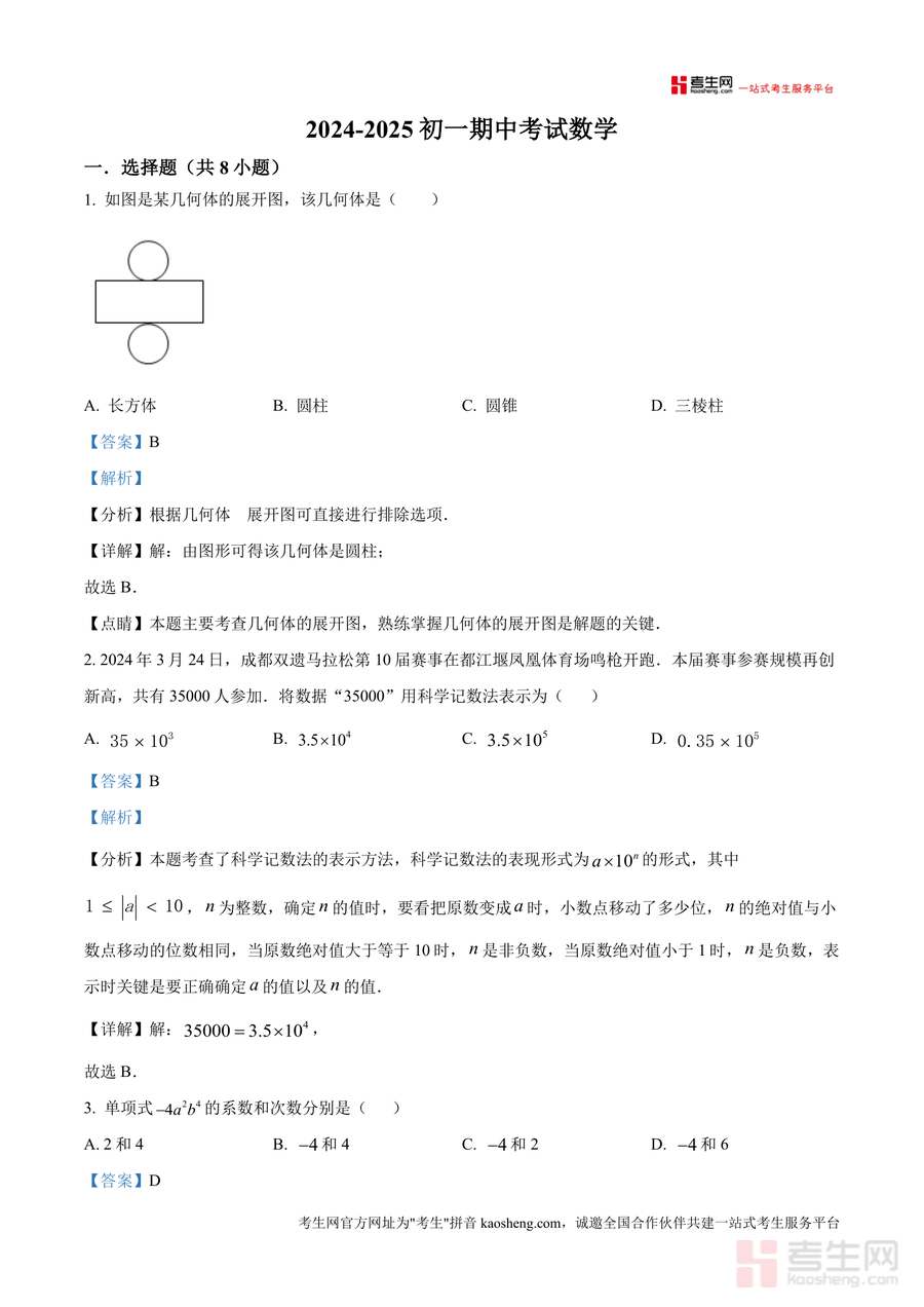 《精品解析:广东省深圳市福田区实验教育集团侨香学校2024-2025学年七年级上学期期中考试数学试卷(解析版).docx》是一份针对七年级上学期数学期中备考需求打造的真题解析类资料。资料包含完整试卷原题及各题型详细解析,覆盖几何体展开图识别、科学记数法表示大数、单项式系数次数判断等核心考点;每个题目均配备精准答案与分层解析,如几何题明确展开图对应几何体类型及截面形状规律,代数题拆解运算步骤并标注易错点(如有理数混合运算符号处理),部分压轴题还总结解题规律(如差倒数循环规律) ,帮助学生理解考点本质与解题逻辑。