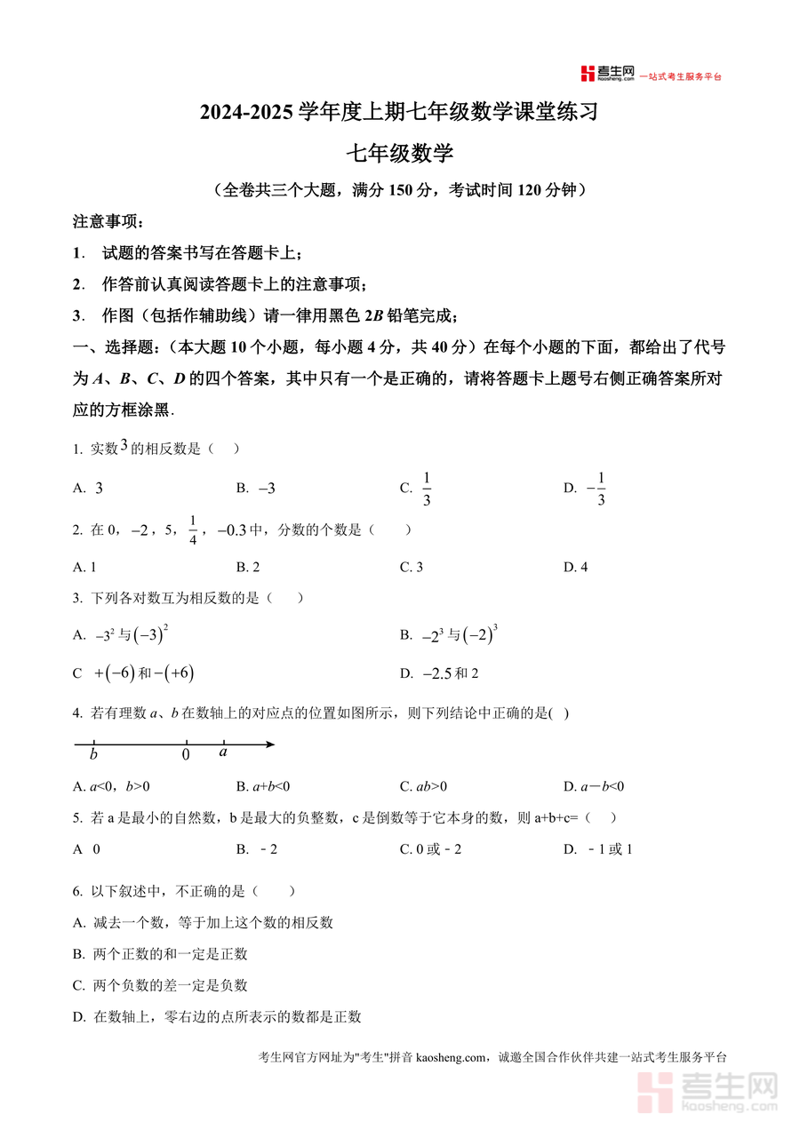 《精品解析:重庆市大足区邮亭中学等五校2024-2025学年七年级上学期期中考试数学试题(原卷版)》是一份针对重庆大足区五校联合命题的七年级数学期中真题原卷资料。该资料严格遵循当地教学大纲要求,包含选择题(10小题共40分)、填空题(8小题共32分)及解答题(8小题共78分)三大题型,覆盖实数相反数、数轴应用、科学记数法、有理数运算等核心知识点,完整还原考试时长120分钟、满分150分的真实场景。其特色在于联合命题带来的区域教学针对性,题型设置兼顾基础巩固与能力拓展,能有效反映该区域七年级数学教学的重点与难点。