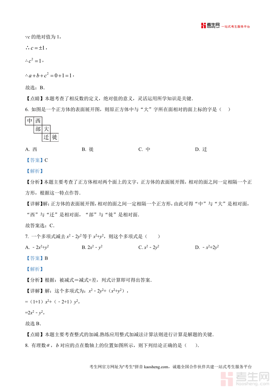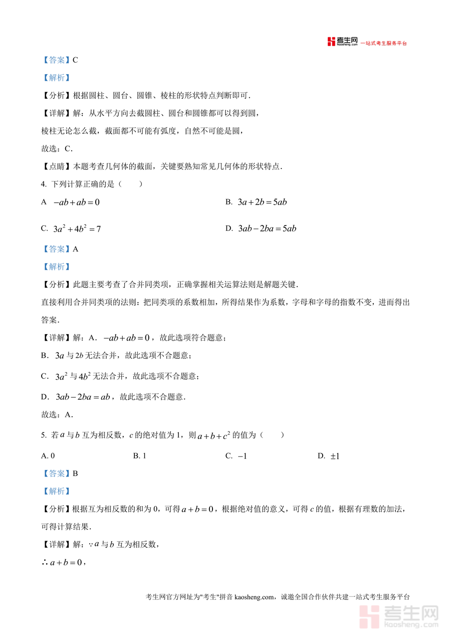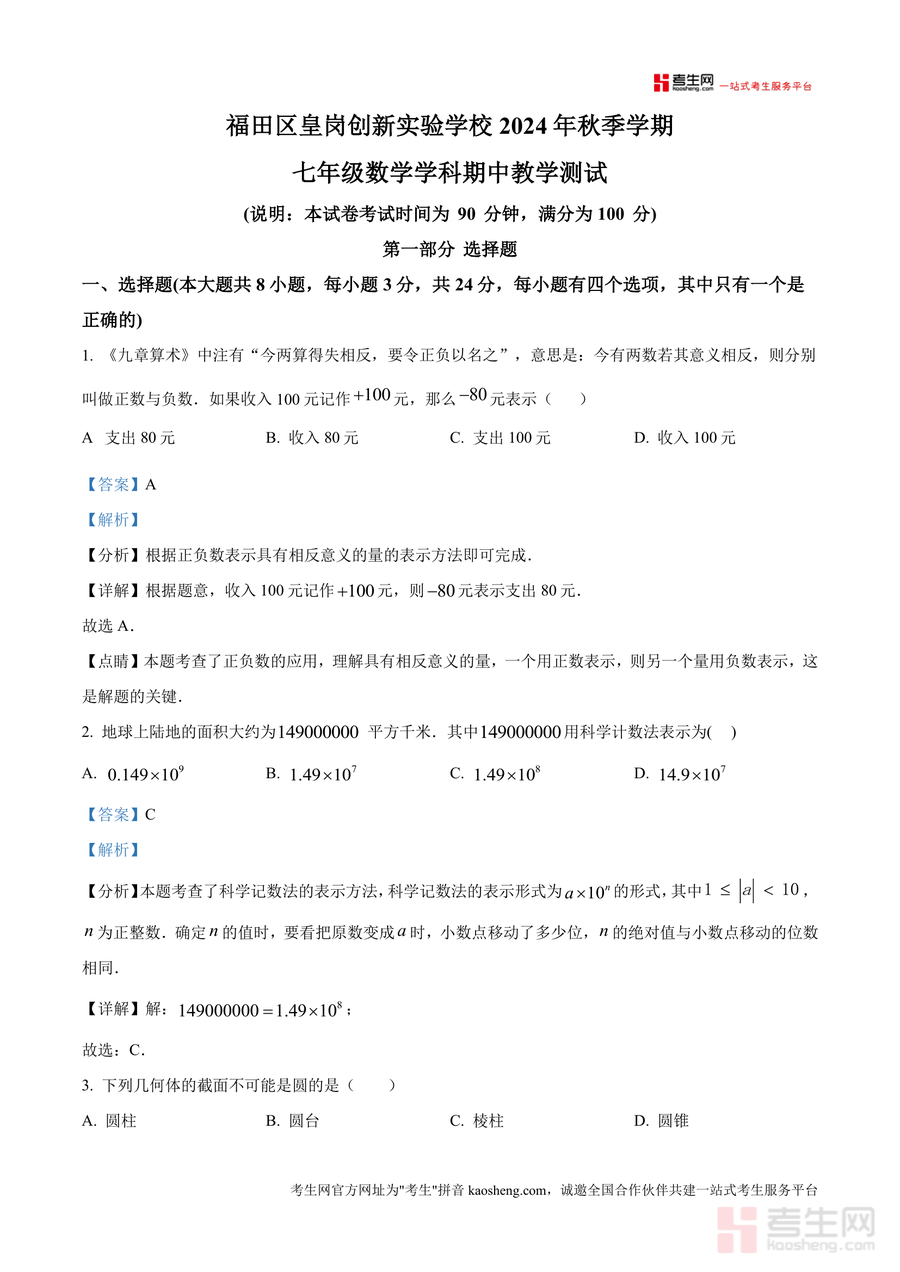 《精品解析:广东省深圳市福田区皇岗创新实验学校2024-2025学年七年级上学期期中考试数学试卷(解析版).docx》是一份针对该校七年级上学期期中数学考试编写 的精准备考资料,覆盖有理数概念、代数式运算、几何体截面等核心章节内容,包含8道选择题、5道填空题、7道解答题全题型深度解析。其特色亮点在于逐题设置"分析""详解""点睛"模块——如第1题结合《九章算术》背景解析正负数应用考点关联,第6题利用正方体相对面规律破解展开图问题,第19题通过等式规律引导归纳法解题思路,帮助学生理解考点本质而非机械记忆。