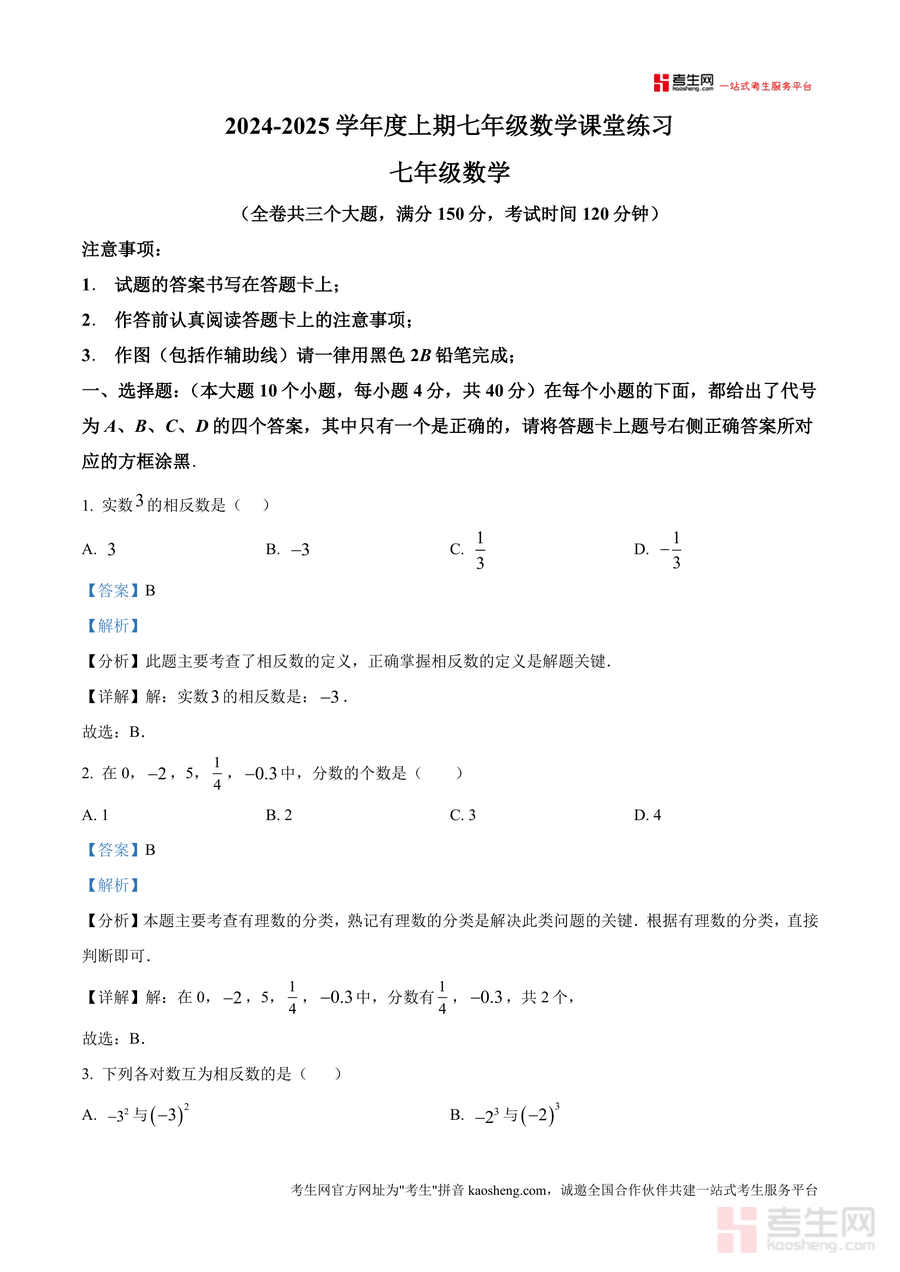 《精品解析:重庆市大足区邮亭中学等五校2024-2025学年七年级上学期期中考试数学试题(解析版)》是一份针对七年级数学期中备考需求开发优质真题解析资料,聚焦五校联考核心考点,涵盖全卷三大题型(选择题、填空题、解答题)完整试题及配套深度解析。其特色亮点在于每道题目均配备考点定位分析、分步解题思路引导、易错点警示及拓展延伸内容——如选择题中相反数定义应用题明确易错混淆点,解答题里有理数混合运算题补充简便算法技巧,有效帮助使用者构建完整知识体系。
