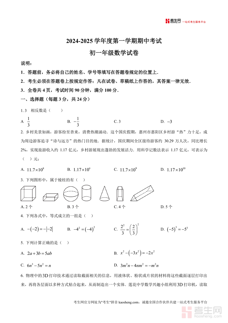 《精品解析:广东省深圳市福田区莲花中学2024-2025学年上学期七年级期中考试数学试卷(原卷版)》是一份针对七年级数学期中考试设计的权威备考资料,完整呈现该校期中考试原卷内容。试卷涵盖选择题(8道)、填空题(5道)及解答题(7道)三大题型,覆盖相反数、科学记数法、棱柱识别、同类项判定等核心知识点,并结合乡村游数据、3D打印技术等生活与科技场景设计题目,既贴合深圳福田区教学进度,又体现数学学科与实际应用融合。作为真题原卷,其题型分布(选择24分、填空15分、解答61分)、分值设置及难度梯度均严格遵循该校期中命题标准,是兼具代表性与实用性的备考资源。