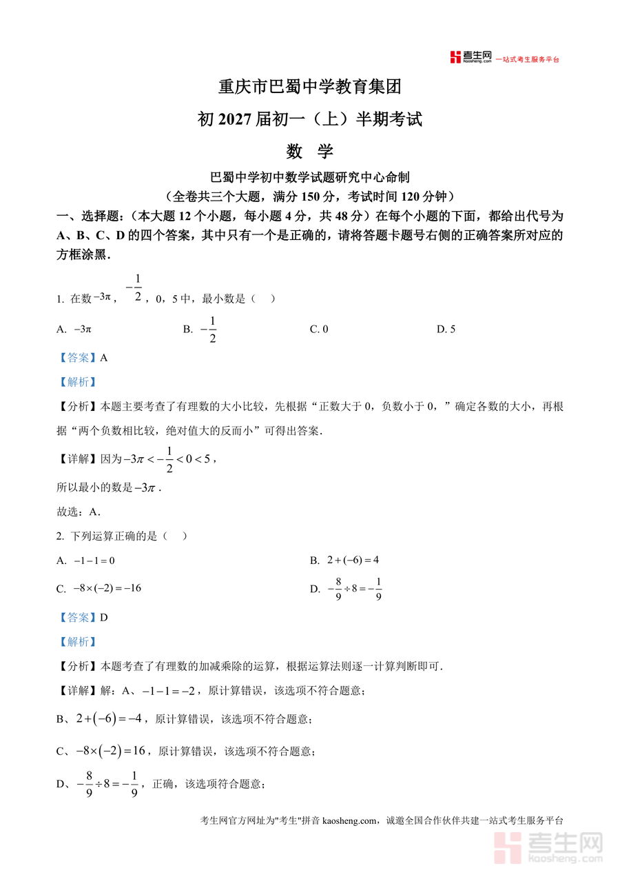 《精品解析:重庆市巴蜀中学教育集团2024-2025学年七年级上学期半期考试数学试题(解析版).docx》是一份针对七年级上学期数学半期考试设计高质量备考资料与真题解析。该资料包含巴蜀中学教育集团初2027届初一上半期考试全套数学试题(含选择、填空、解答三大题型)及详细解析,试题由巴蜀中学初中数学试题研究中心命制,贴合重庆本地教学大纲;解析部分除标准答案外,还附带考点分析、解题思路拆解及易错点警示,助力使用者深度掌握知识应用逻辑。
