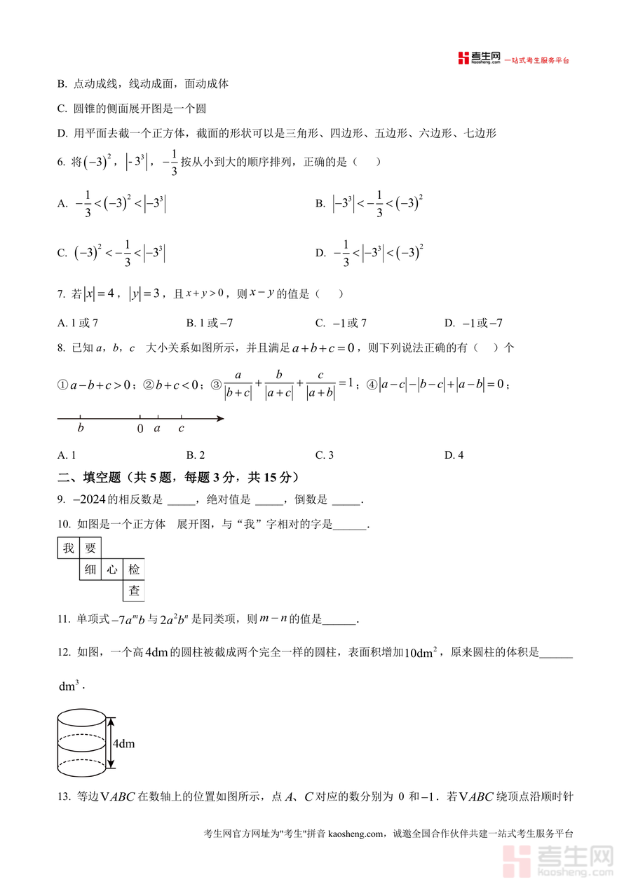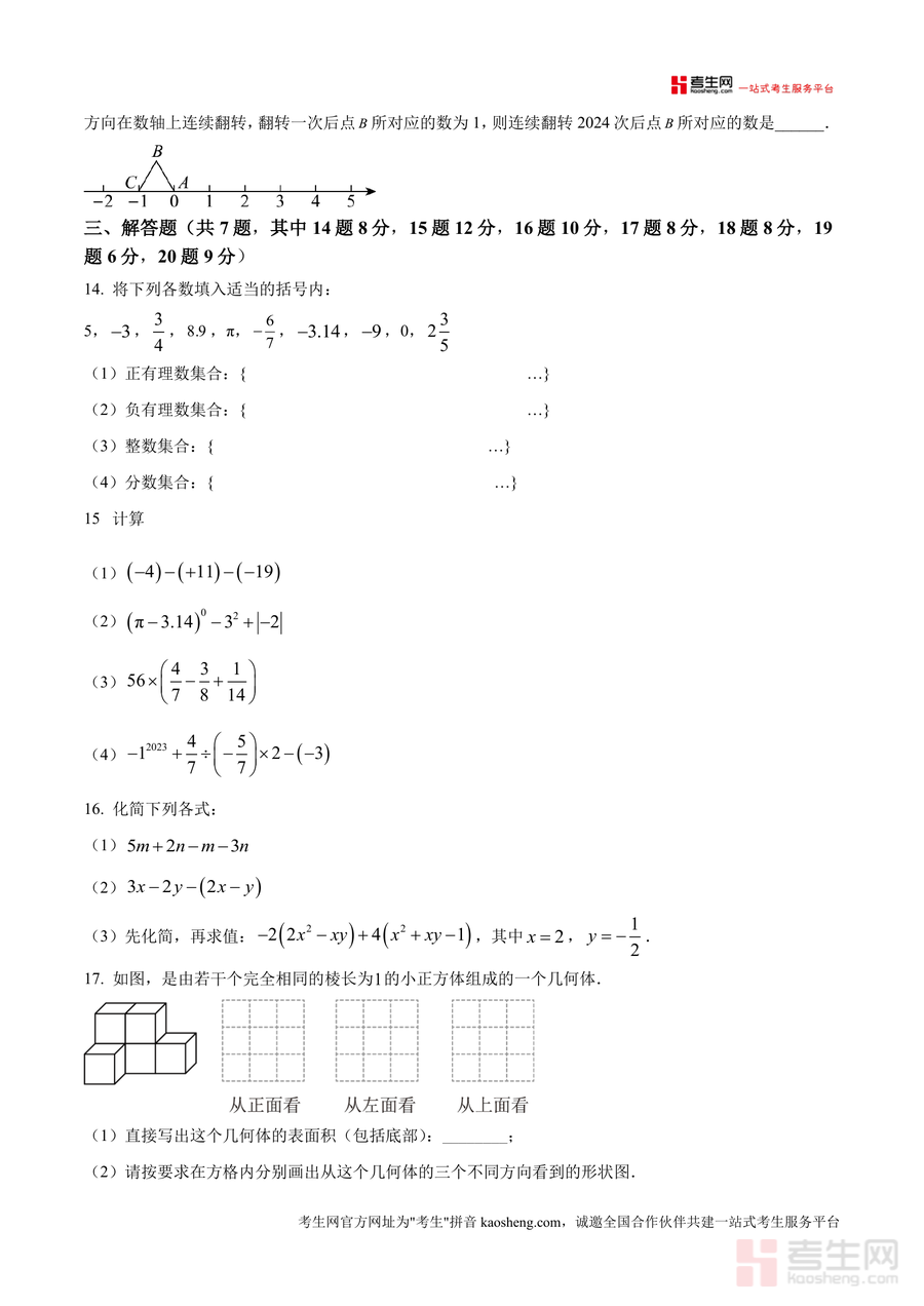 《精品解析:广东省深圳市罗湖外语初中学校2024-2025学年上学期七年级期中考试数学试卷(原卷版).docx》是一份针对深圳罗湖区域七年级学生数学期中备考的权威真题资料,聚焦七年级上册数学核心知识点与能力要求。该试卷严格遵循深圳初中数学教学大纲,涵盖有理数意义与运算、科学记数法、立体图形展开与旋转、代数式化简求值、数轴应用等关键内容,题型设置包含单选题(8题24分)、填空题(5题15分)及解答题(7题61分)三大模块。其特色亮点在于保留了罗湖外语初中学校期中真题的原始结构与命题风格——如解答题中融入数轴上"美好点"定义类创新题型,既贴合教材重点又体现区域教学特色;同时原卷版完整呈现考试说明与答题规范要求,还原真实考试情境。