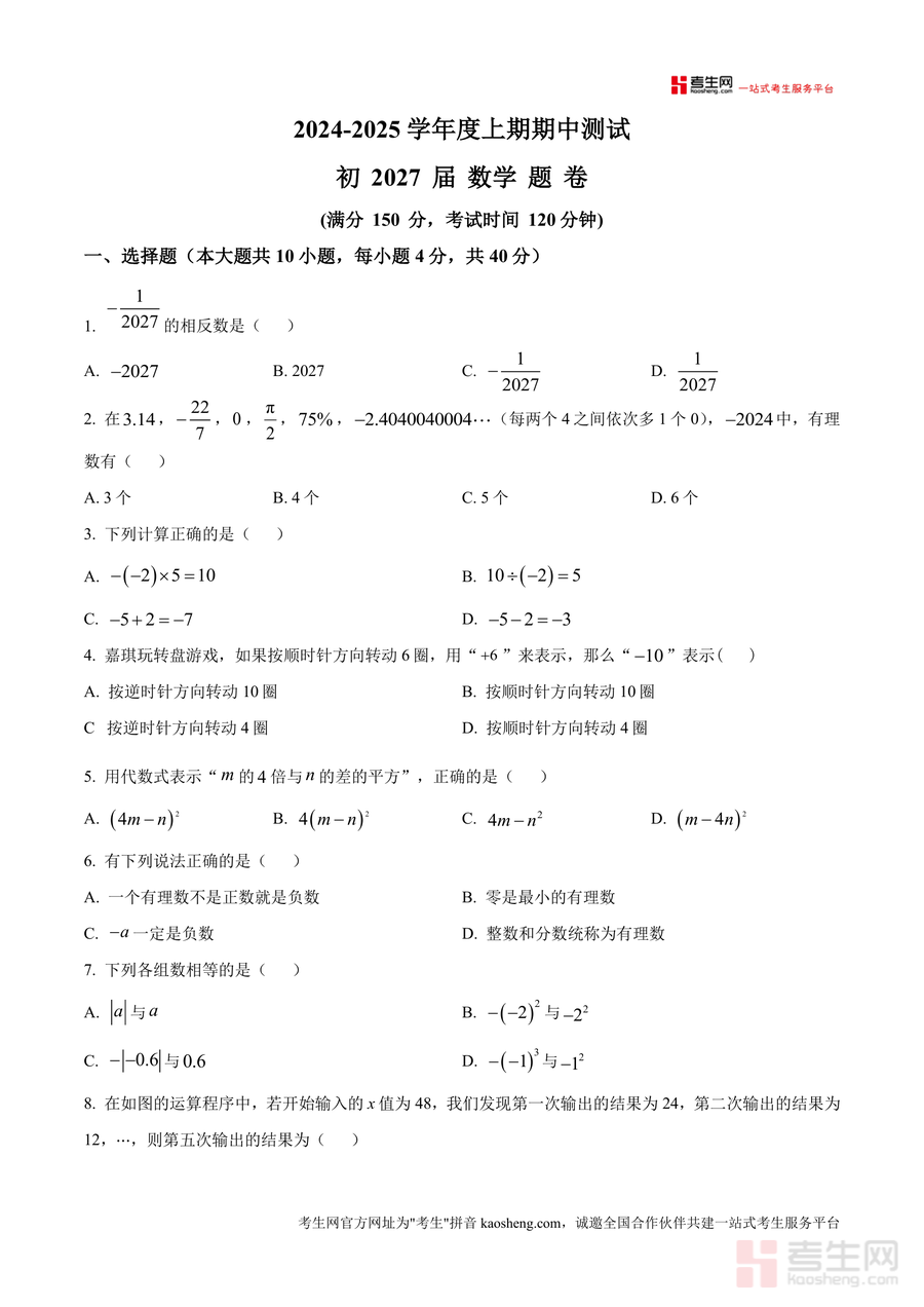 《精品解析:重庆市江津二中联盟十校联考2024-2025学年上学期七年级数学期中测试题(原卷版).docx》是一份针对七年级上学期数学期中备考设计的区域联考真题资料。该资料包含选择题(10小题共40分)、填空题(8小题共32分)及解答题(8小题共78分)三大题型板块,考点覆盖有理数运算、代数式表示与求值、数轴应用、规律探究、实际问题解决等七年级上册核心知识模块。其特色在于依托江津二中联盟十校联考的区域权威性,题型设置严格遵循课标要求,题目情境贴近本地教学实际,能精准反映区域阶段性教学的重点与难点,为使用者提供高质量的真题训练素材。