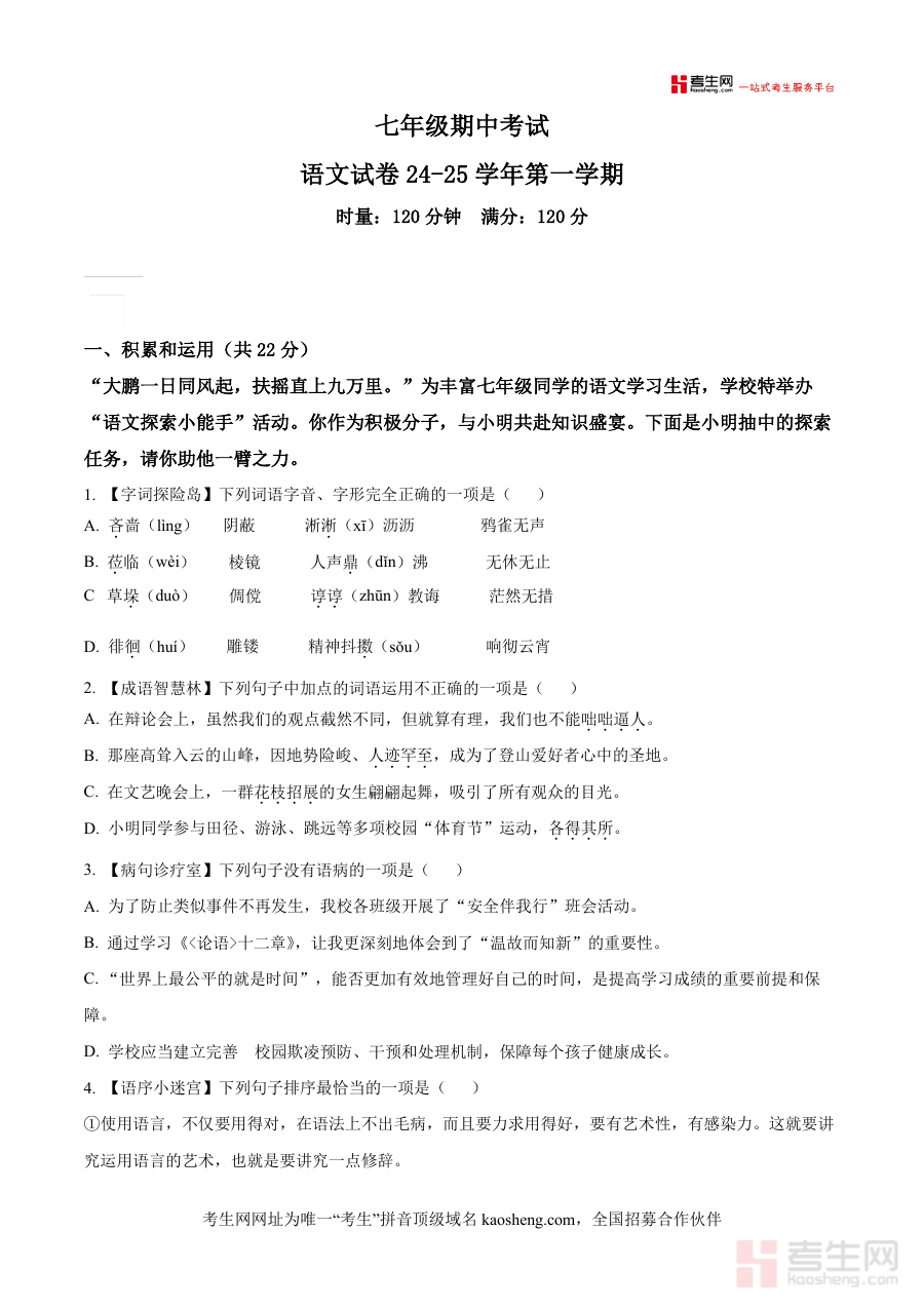 《精品解析:湖南省长沙市明德教育集团2024-2025学年七年级上学期期中语文试题(原卷版)(1).docx》是一份针对七年级上学期语文期中阶段检测设计高质量备考资料,涵盖积累运用与阅读理解两大核心板块:积累运用包含字词辨识(字音字形辨析)、成语运用判断等基础题型,还设有古诗文默写及综合性学习任务;阅读部分覆盖古诗文阅读(诗歌赏析+文言文理解)、非文学作品阅读(材料分析)及文学作品阅读(记叙文阅读),题型贴合新课标核心素养要求,命题紧密结合明德教育集团教学重点,反映区域学情特点。