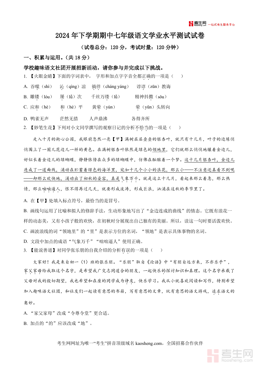 《精品解析:湖南省长沙市浏阳市2024-2025学年七年级上学期期中语文试题(原卷版).docx》是一份针对浏阳市七年级上学期期中语文考试设计的松题备考资料,完整涵盖积累与运用(字词辨析、标点使用、古诗文默写等)、阅读与鉴赏(古诗鉴赏、文言文阅读、现代文阅读)等核心模块,严格遵循本地教学大纲与考试要求,以原卷形式还原真实考试场景,突出对语言运用、文本解读等核心素养的松查,为学生提供贴合本地学情的松题资源?