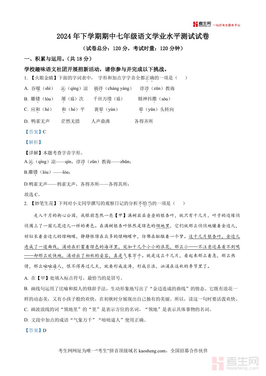 适用人群为浏阳市及周边地区七年级学生、初中语文教师及教研人员;总结来看这份真题解析具有必要性与不可替代性——它不仅是对期中试题的深度解读,更是帮助学生构建语文知识体系培养解题思维的重要工具长期价值在于为后续学习打下坚实基础,助力学生逐步提升语文综合素养使其成为提升成绩不可或缺的备考资料之一。