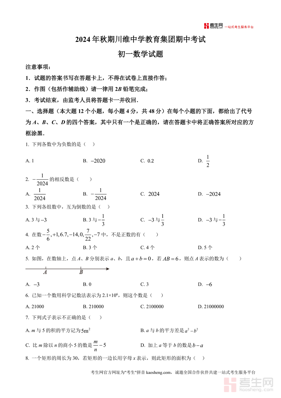 《精品解析:重庆市长寿川维中学校2024-2025学年七年级上学期11月期中数学试题(原卷版)》是一份针对重庆本地七年级上学期期中阶段数学学习检测的权威真题资料,精准匹配人教版七年级上册教材进度,完整呈现该校教育集团期中考试的命题结构与内容。资料包含选择题(12小题共48分)、填空题(6小题共24分)及解答题(8小题共78分)三大题型板块,覆盖负数判断、相反数与倒数应用、科学记数法转换、整式运算、数轴问题等核心知识点;其特色在于严格还原该校期中测试原题形式与评分标准,融入进制转换、"回头差"游戏探究等本地教学特色创新题型,为使用者提供真实考试场景参考。