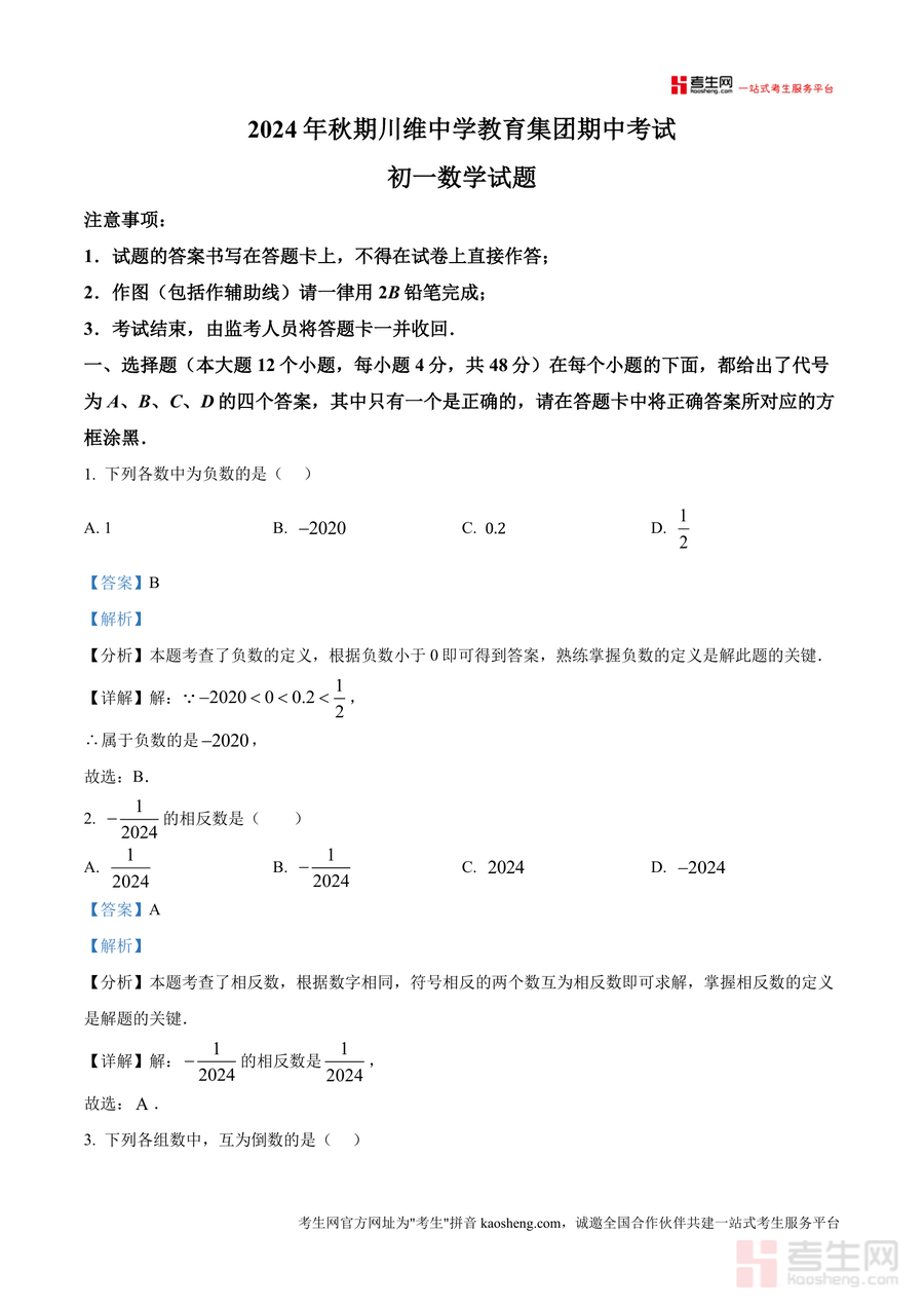 《精品解析:重庆市长寿川维中学校2024-2025学年七年级上学期11月期中数学试题(解析版)》是一份针对七年级上册数学期中备考设计、贴合重庆本地校考实际需求的真题解析资料。该资料包含完整试题及逐题详细解析,覆盖负数定义、相反数概念、倒数判断、科学记数法转换等核心知识点;每道题均配备考点分析、步骤详解及解题点睛——如选择题中对负数定义与相反数概念 的精准阐释,填空题里科学记数法的转换方法指导,解答题的运算步骤规范等,助力使用者精准把握题型规律与答题技巧。