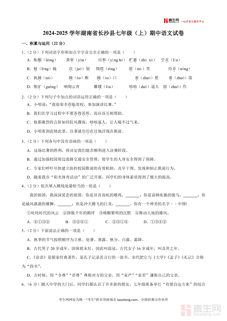 本资料适用于长沙县及周边地区七年级学生、初中语文教师及关注孩子语文学习进展的家长群体;作为本地期中真题资料具有不可替代性——真实反映本地考试难度与方向,为备考提供直接参考;长期价值体现在不仅助力期中取得优异成绩,还能帮助学生构建系统知识框架、培养规范答题习惯,夯实语文基础并持续提升综合素养与应试能力,为后续学习奠定坚实基础。