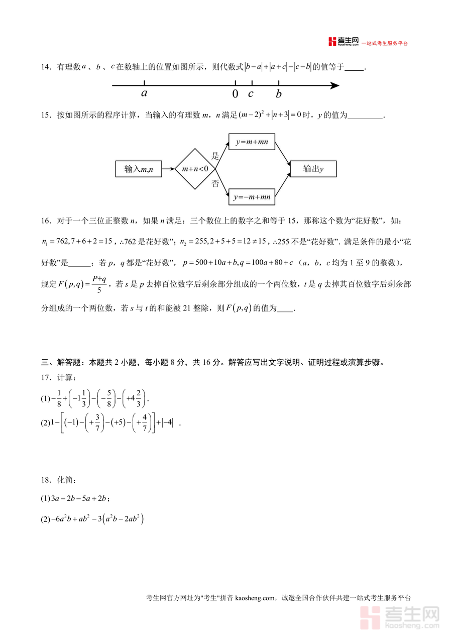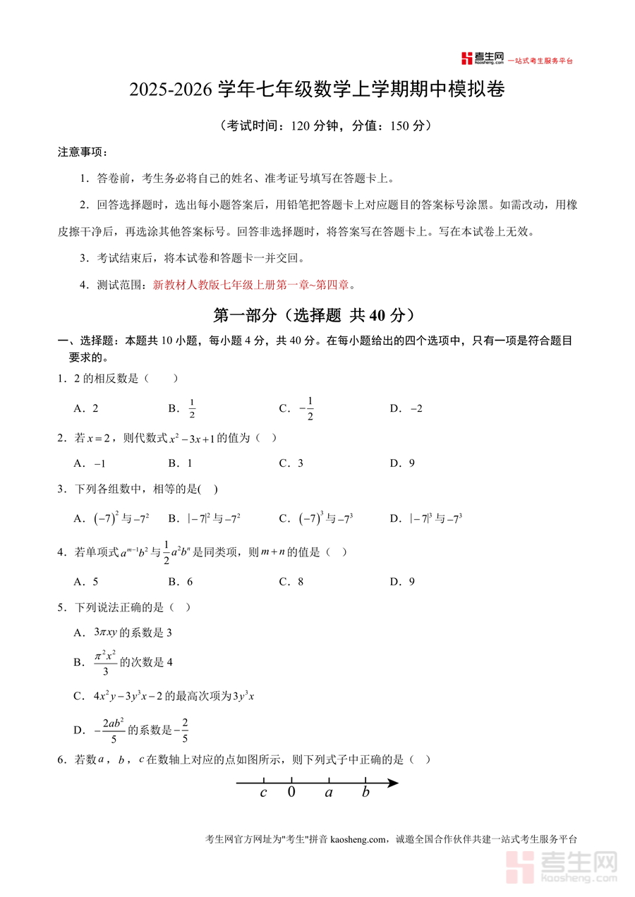 该模拟卷核心用途为助力学生期中前自测与知识漏洞排查,适用场景包括课堂限时训练、家庭自主复习及考前全真模拟等。学生通过完成120分钟限时测试,可熟悉考试流程与答题规范,提升时间管理能力;教师可将其作为单元复习后的评估工具,精准定位学生知识薄弱环节;家长则能借助试卷了解孩子学习进度与能力水平。其备考优势在于考点覆盖全面,题目梯度合理,从基础概念(如相反数、同类项判定)到综合应用(如数轴与代数式结合问题、代驾收费实际应用题),有效衔接教材知识点与考试要求,帮助学生快速提升应试能力。