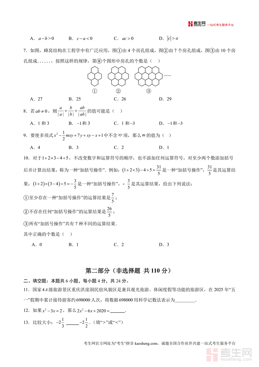 《七年级数学期中模拟卷【测试范围:新教材人教版七年级上册第一章~第四章】(考试版).docx》是一份针对2025-2026学年七年级上册数学期中备考设计的标准化模拟资料。其内容严格遵循人教版新教材第一章至第四章教学大纲,涵盖有理数、代数式、整式加减及一元一次方程等核心模块,题型设置与真实期中试卷高度一致,包含10道选择题(40分)、6道填空题(24分)及7道解答题(86分),同时融入规律探究(如蜂窝结构房孔数量规律)、整体思想应用(如代数式整体代入求值)等能力型题目,既注重基础知识点的精准考查,又强化对学生逻辑思维与应试能力的系统训练。