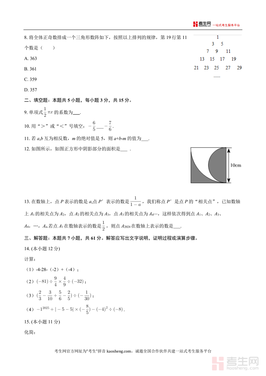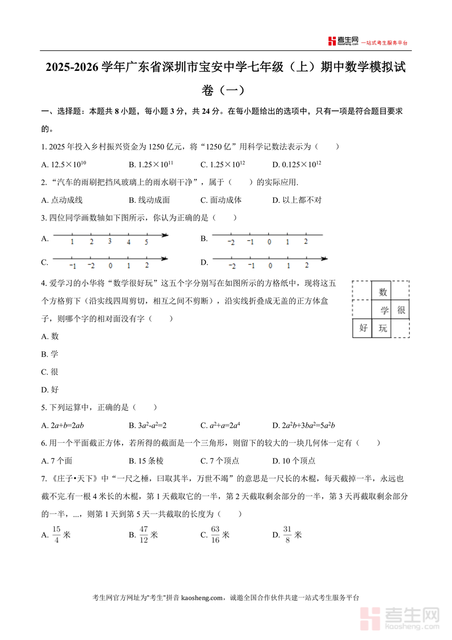 本试卷主要适用于宝安中学七年级学生进行期中复习自测、深圳市其他初中同年级学生强化期中备考训练、数学教师作为教学参考资料设计教学活动。它具有不可替代性——因其严格匹配该校教学进度与考点分布,是针对性提升成绩的必要资源;长期价值体现在帮助学生巩固七年级上册数学基础概念与运算能力,为后续学习几何与代数进阶内容奠定扎实根基。