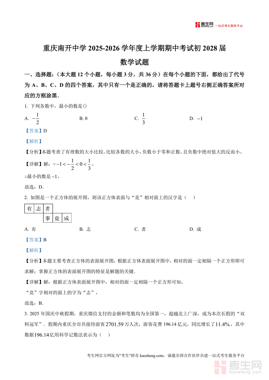 《精品解析:重庆市南开中学校2025-2026学年上学期七年级期中数学考试卷(解析版)》是一份针对七年级学生期中数学备考的高质量真题解析资料。文件包含完整考试卷及每题详细解析,覆盖有理数大小比较、正方体展开图识别、科学记数法应用等核心知识点,解析部分不仅给出正确答案,还通过“分析”环节点明考点及解题思路,如选择题中对有理数比较规则和正方体展开图相对面特征的深度解读,帮助学生把握命题方向。作为权威名校真题资源,其题型设置贴合教学大纲,能有效反映期中考查重点,助力学生夯实基础。