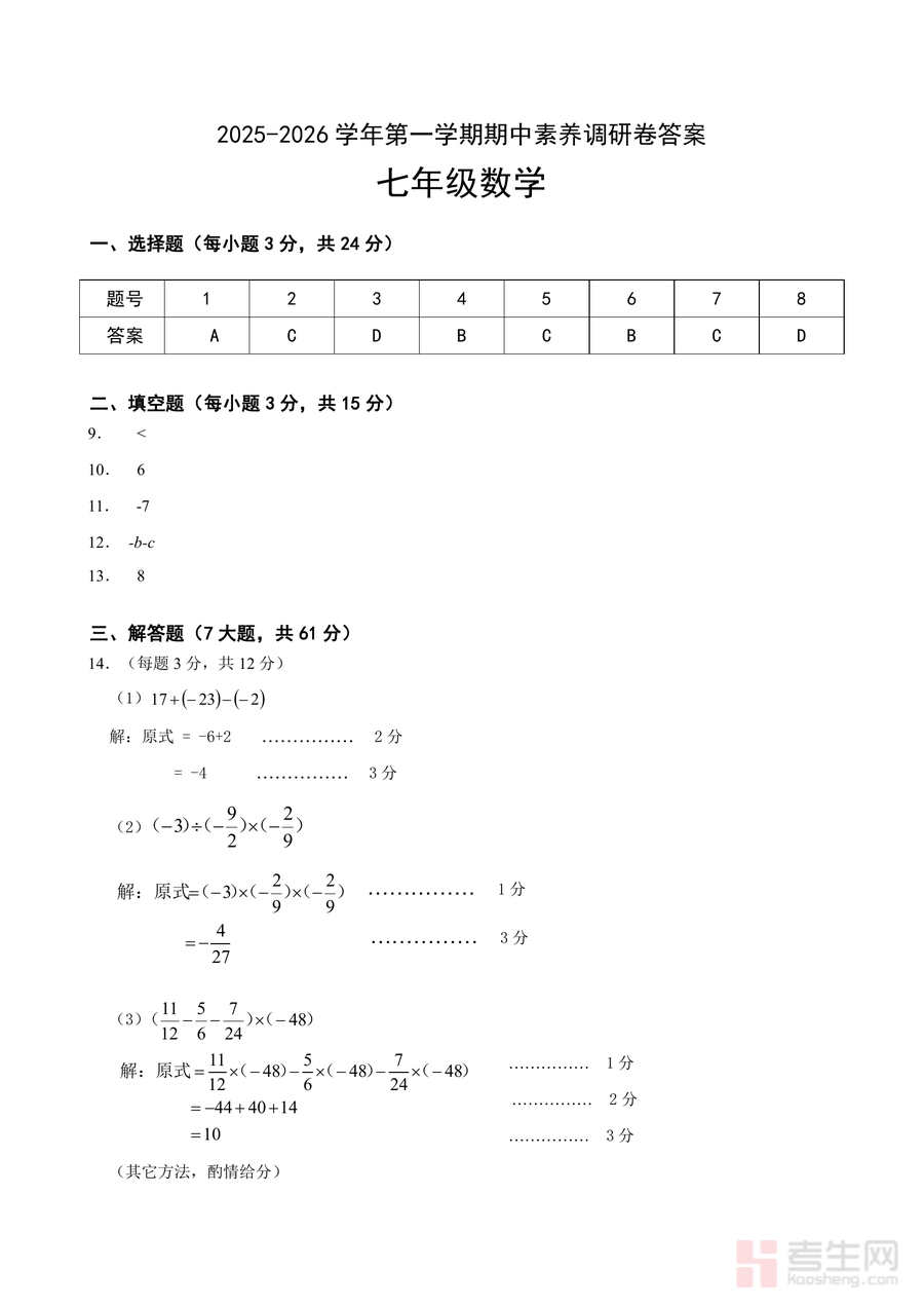 《广东省深圳市宝安区2025-2026学年七年级上学期期中考试数学试卷(答案).pdf》是一份针对该区域七年级上学期数学期中测评的专业备考资料与真题解析文件。文件涵盖选择题、填空题、解答题三大题型的完整答案及详细解题步骤,每道题均标注评分细则与酌情给分说明,如解答题中对不同解题方法的认可标准,帮助使用者精准把握得分要点。其特色在于结合当地教学大纲与考试趋势,呈现符合宝安区学情的真题解析内容,为使用者提供权威且实用的参考依据。