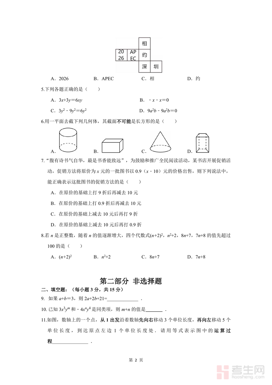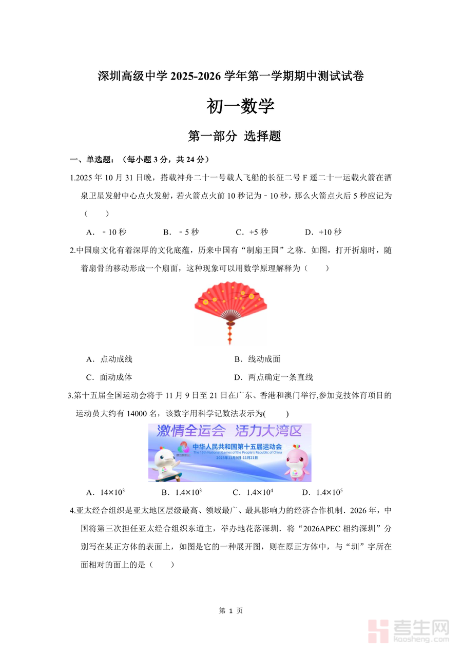 《广东省深圳高级中学2025-2026学年七年级上学期期中数学试题.pdf》是一份针对深圳高级中学七年级学生期中备考设计的权威真题资料,涵盖有理数概念及运算、整式加减、几何图形识别与展开图、新定义运算等七年级上册核心知识点。试题设计结合神舟二十一号发射、第十五届全运会、APEC深圳举办等时事背景,将数学知识与实际生活紧密联系,题型包括单选题、填空题、解答题三大类,全面覆盖期中考查范围,体现该校教学重点与命题特色,是兼具实用性与针对性的备考资料。