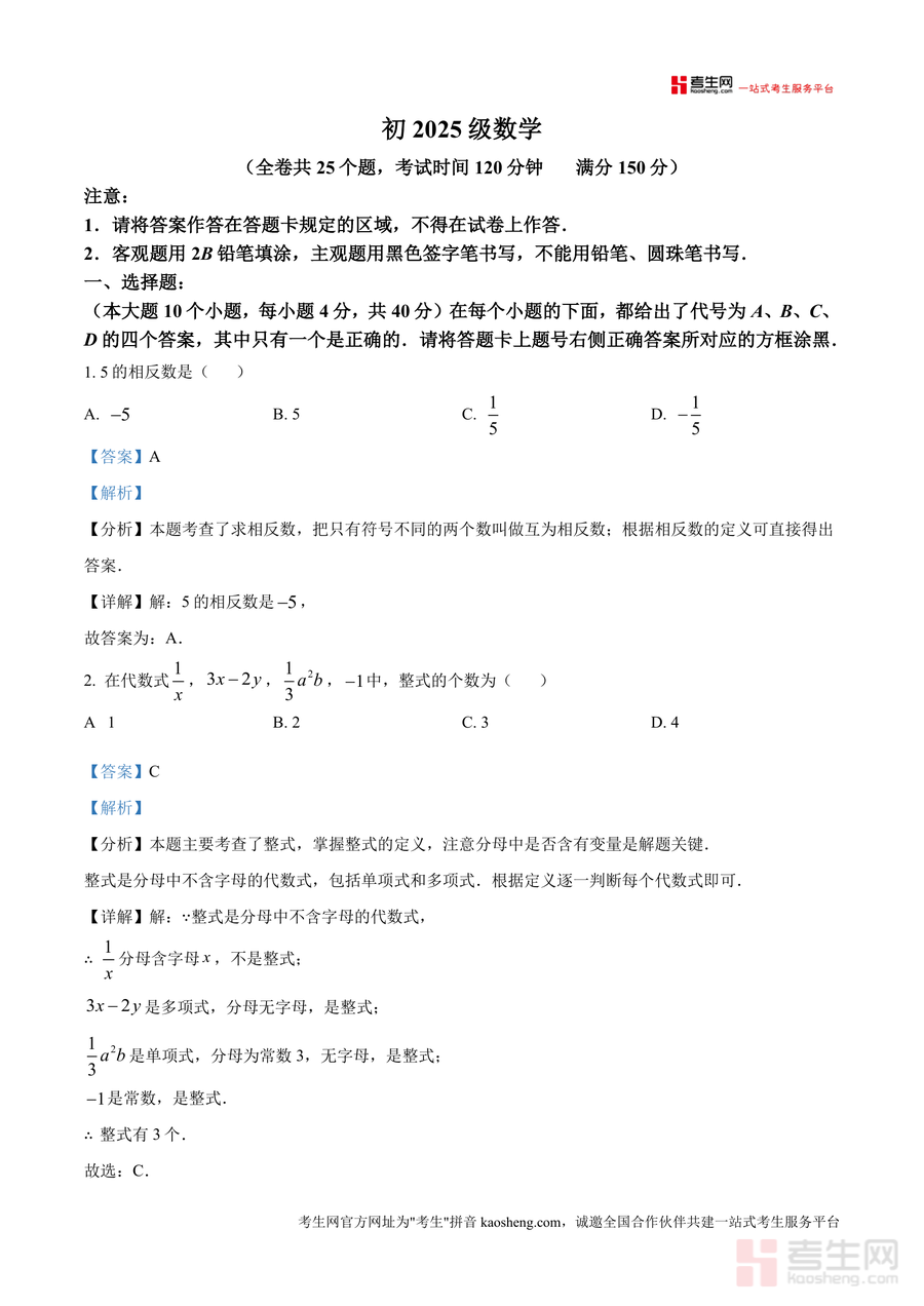 《精品解析:重庆市万州国本中学校2025-2026学年上学期七年级期中数学试卷(解析版).docx》是一份针对七年级学生期中数学备考需求的专业真题解析资料。该资料包含全卷25道试题(选择题10题、填空题6题、解答题8题) 的完整深度解析,覆盖相反数定义、整式分类、数轴三要素等基础考点,以及规律探究型问题、带字母绝对值化简等综合题型;其特色在于每道题均配备考点定位、分步解题思路及易错点警示,如对多项式三次项系数概念拆解、科学记数法规则详细说明,助力学生精准把握知识本质。
